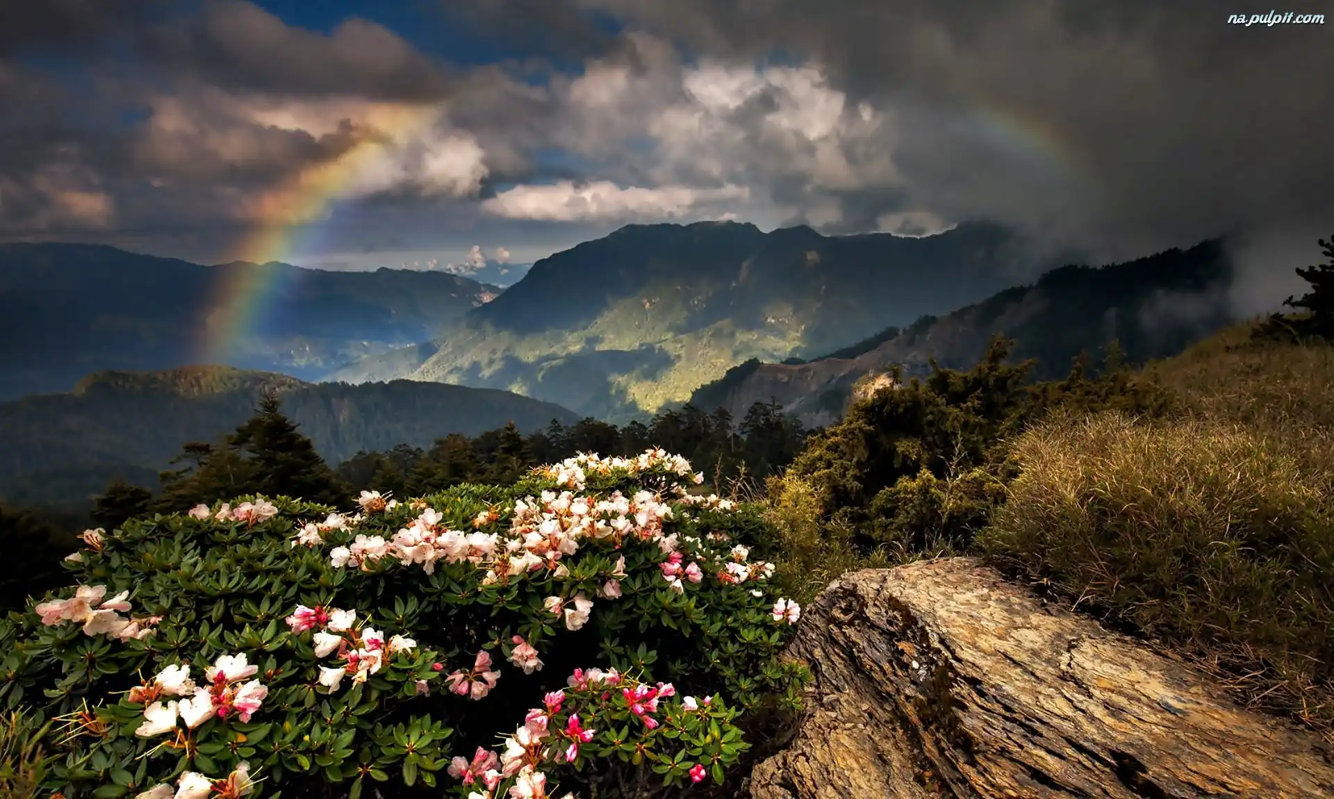 Lasy, Chmury, Tęcza, Łąka, Góry, Rododendrony Na Pulpit