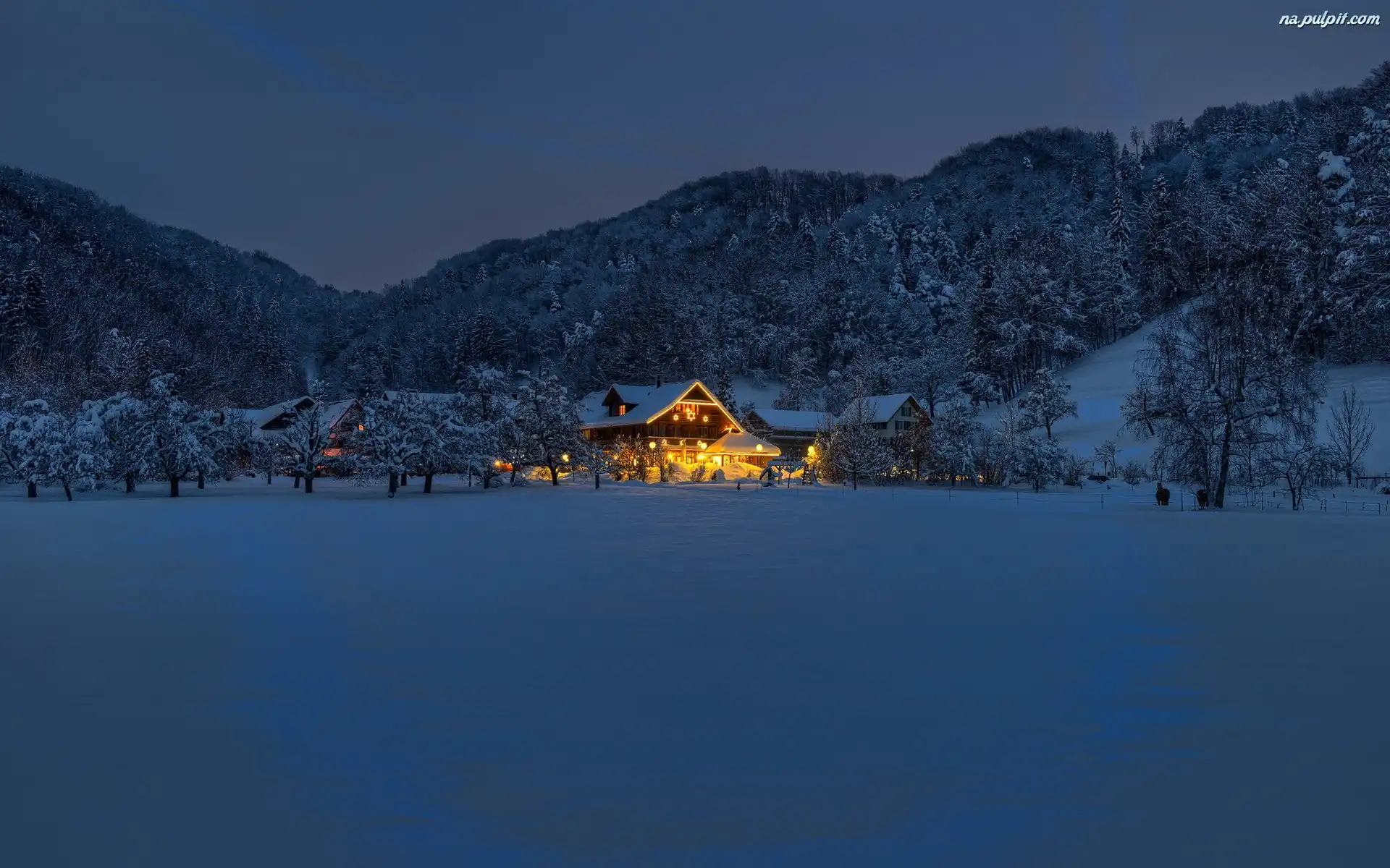 Lasy, Noc, Zima, Oświetlony, Góry, Dom Na Pulpit