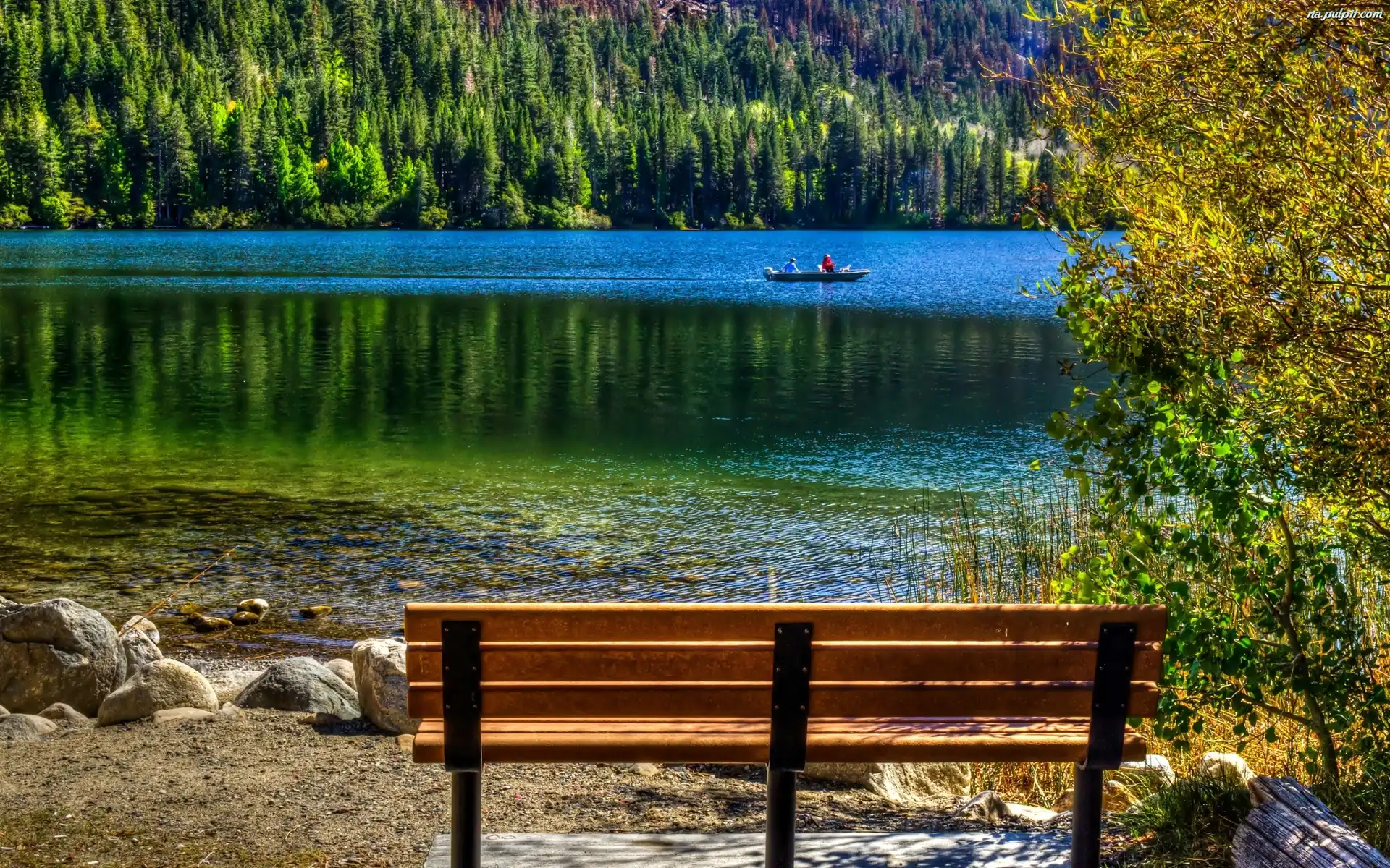 Lasy, Łódka, Jezioro, Ławka