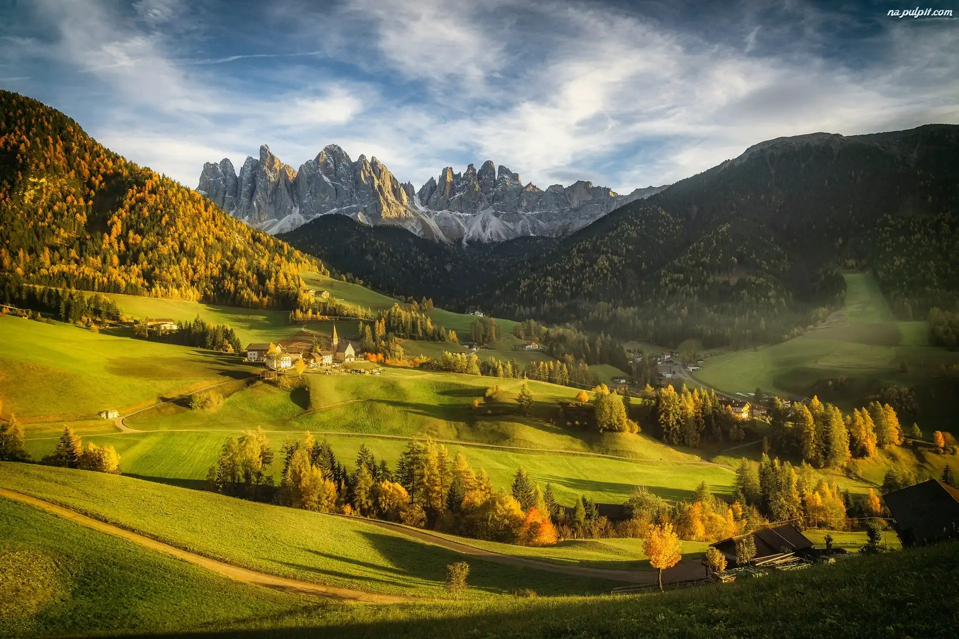 Lasy, Dolomity, Dolina Val di Funes, Wieś Santa Maddalena, Drzewa, Jesień, Góry, Włochy, Masyw Odle Na Pulpit |