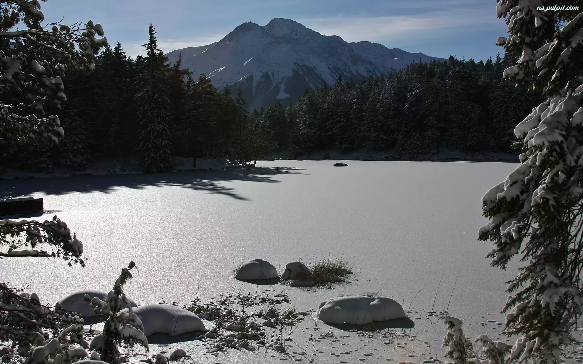 Lasy, Śnieg, Zima, Rzeka, Góry