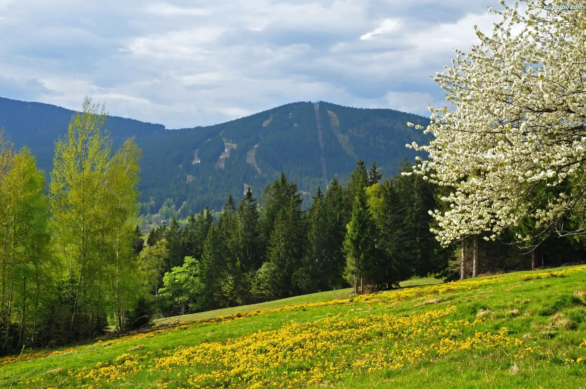 Wiosna, Lasy, Drzewo, Kwiaty, Łąka, Góry, Kwitnące