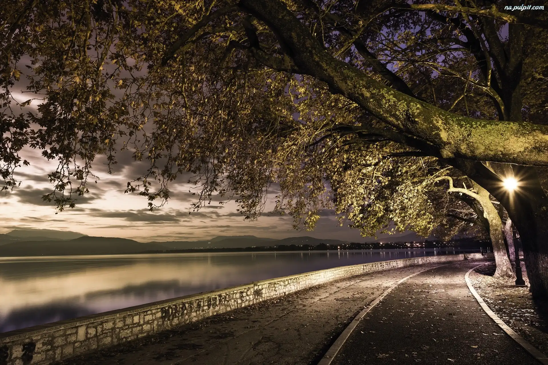 Miejscowość Janina, Bulwar, Zmierzch, Joanina, Grecja, Drzewa, Jezioro Pamvotida, Latarnia Na Pulpit |