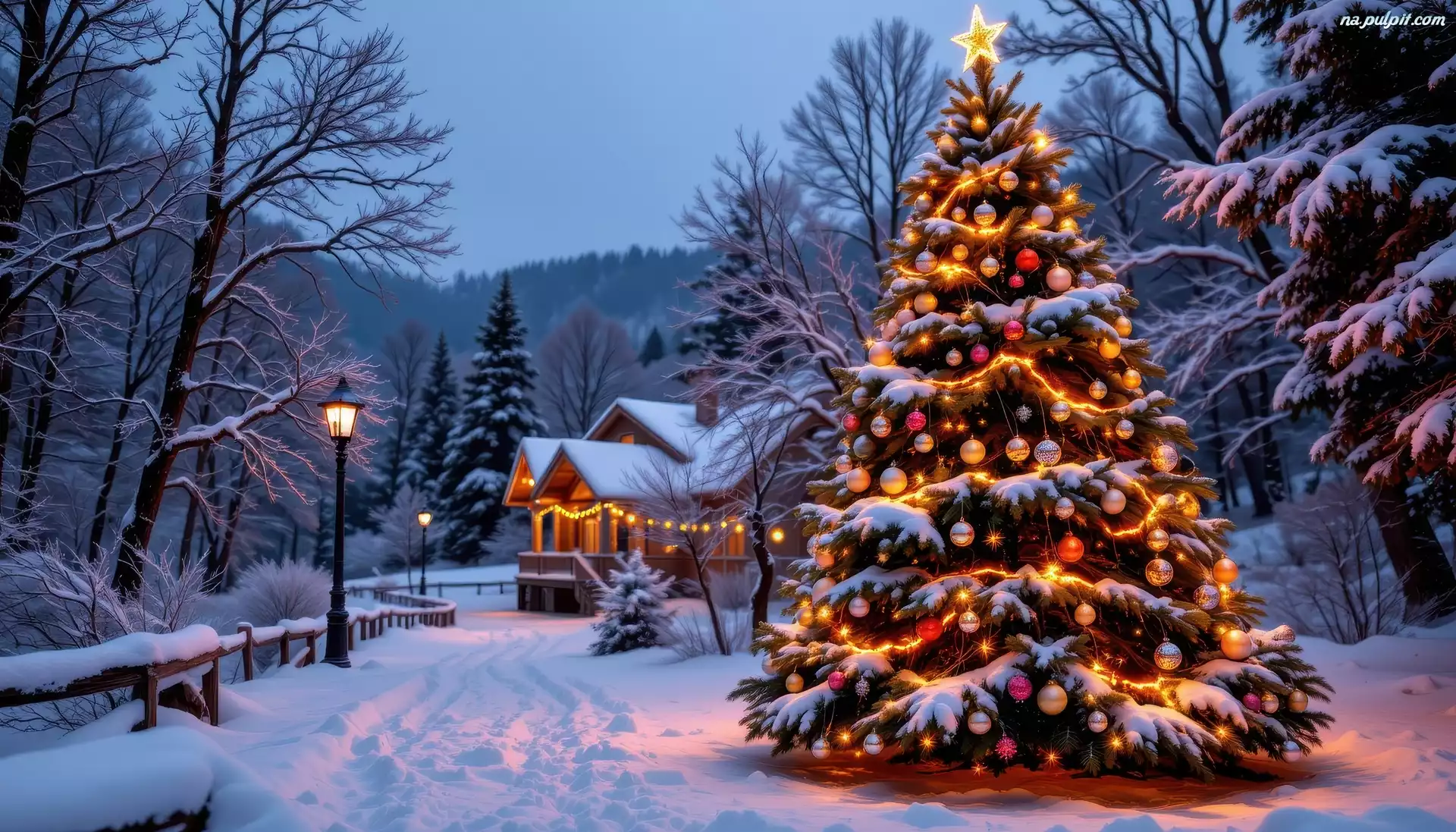 AI, Drzewa, Dom, Zima, Boże Narodzenie, Choinka, Latarnie Na Pulpit