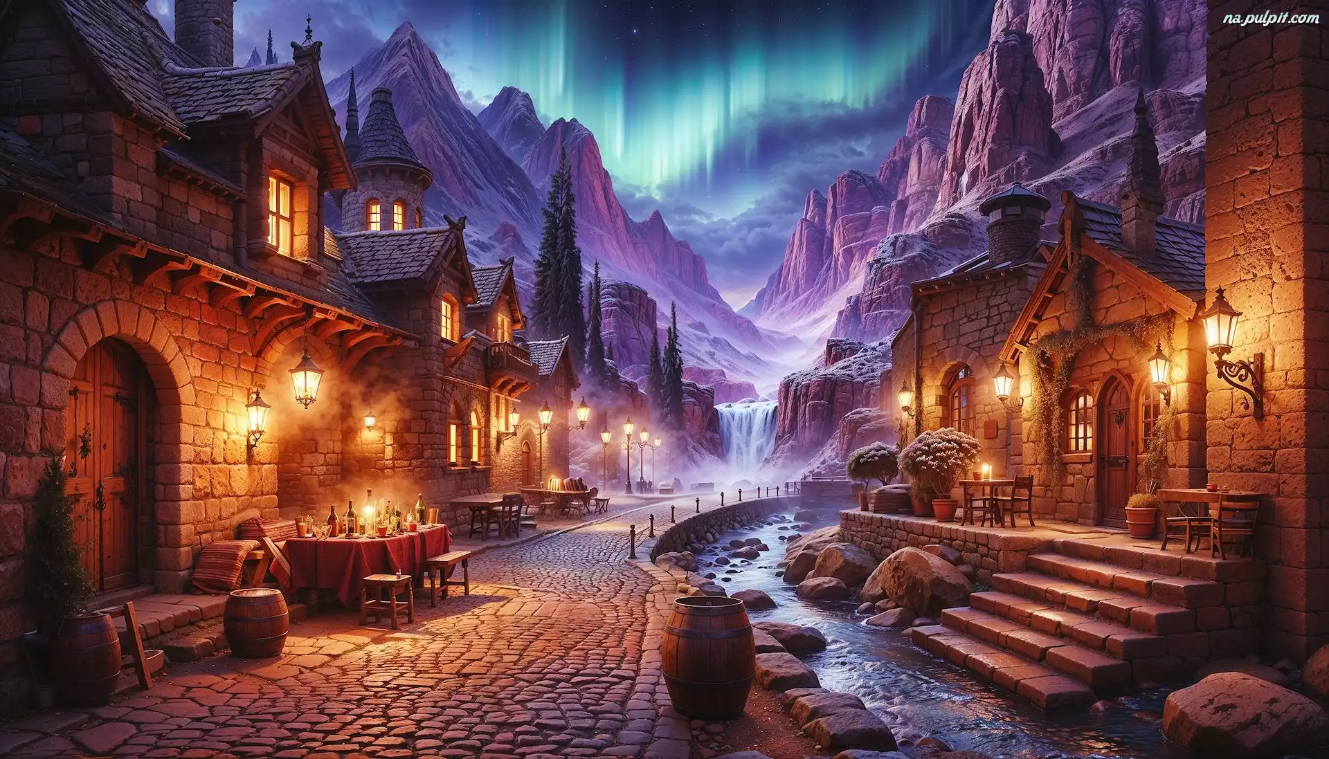 Zorza polarna, Grafika, Latarnie, Rzeka, Domy, Góry Na Pulpit