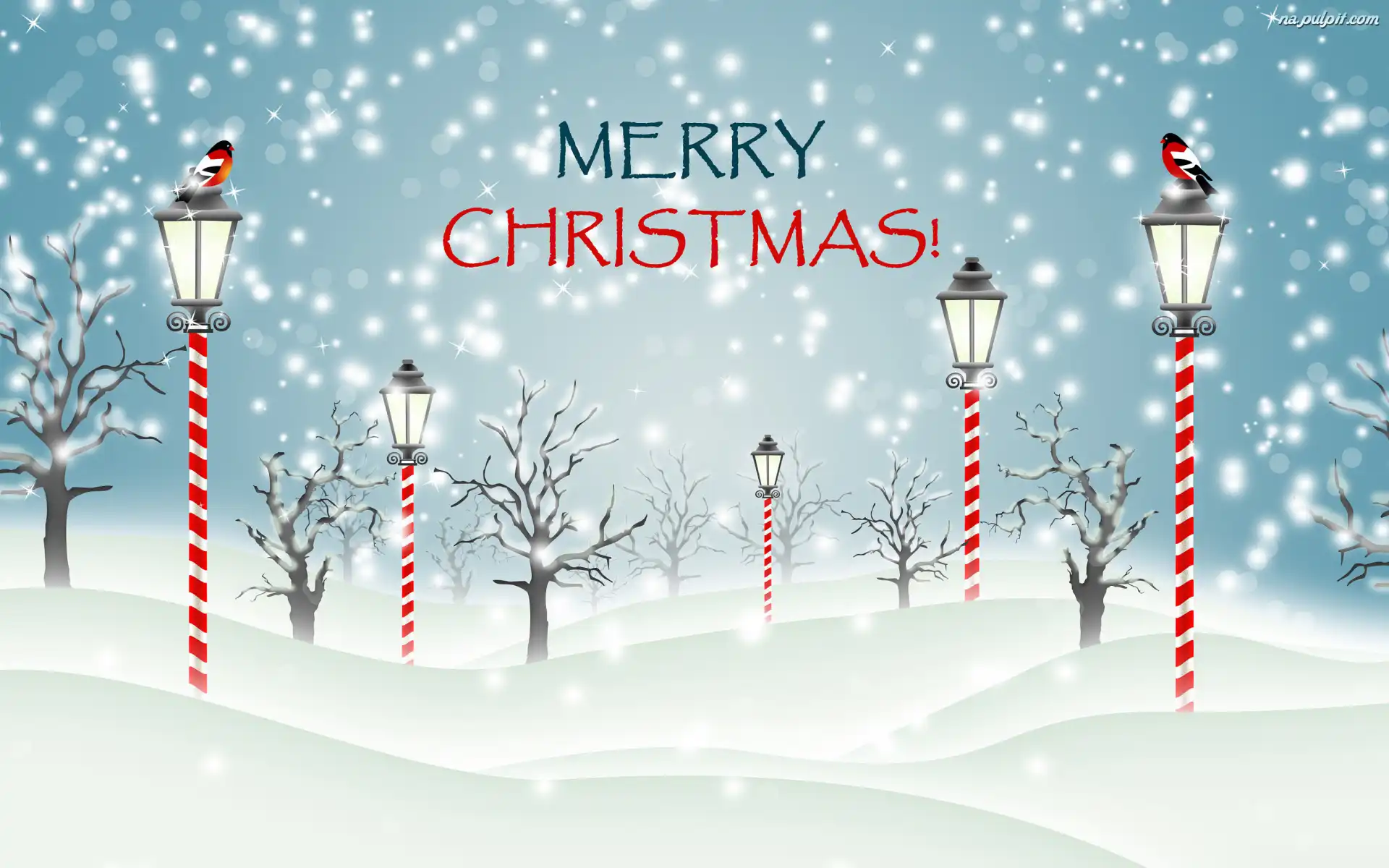 2D, Latarnie, Merry Christmas, Śnieg, Ptaki, Drzewa, Napis