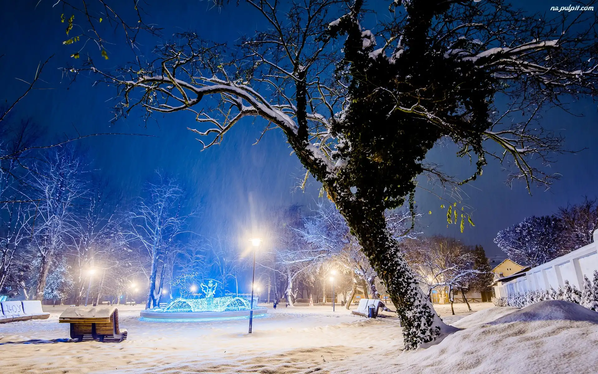 Latarnie, Fontanna, Zima, Park, Drzewa Na Pulpit