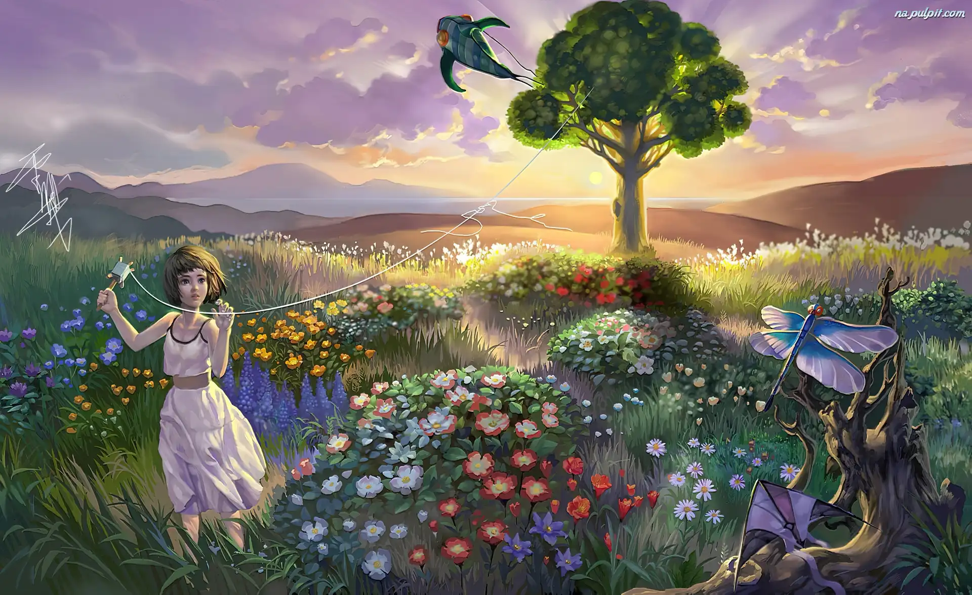 Latawiec , Łąka, Dziewczynka, Kwiaty Na Pulpit