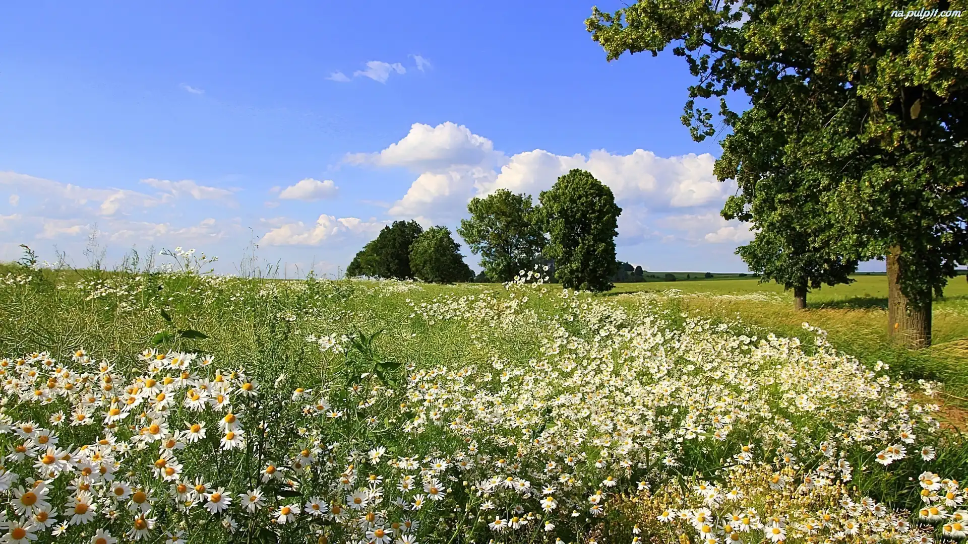 Lato, Rumianki, Łąka, Drzewa Na Pulpit