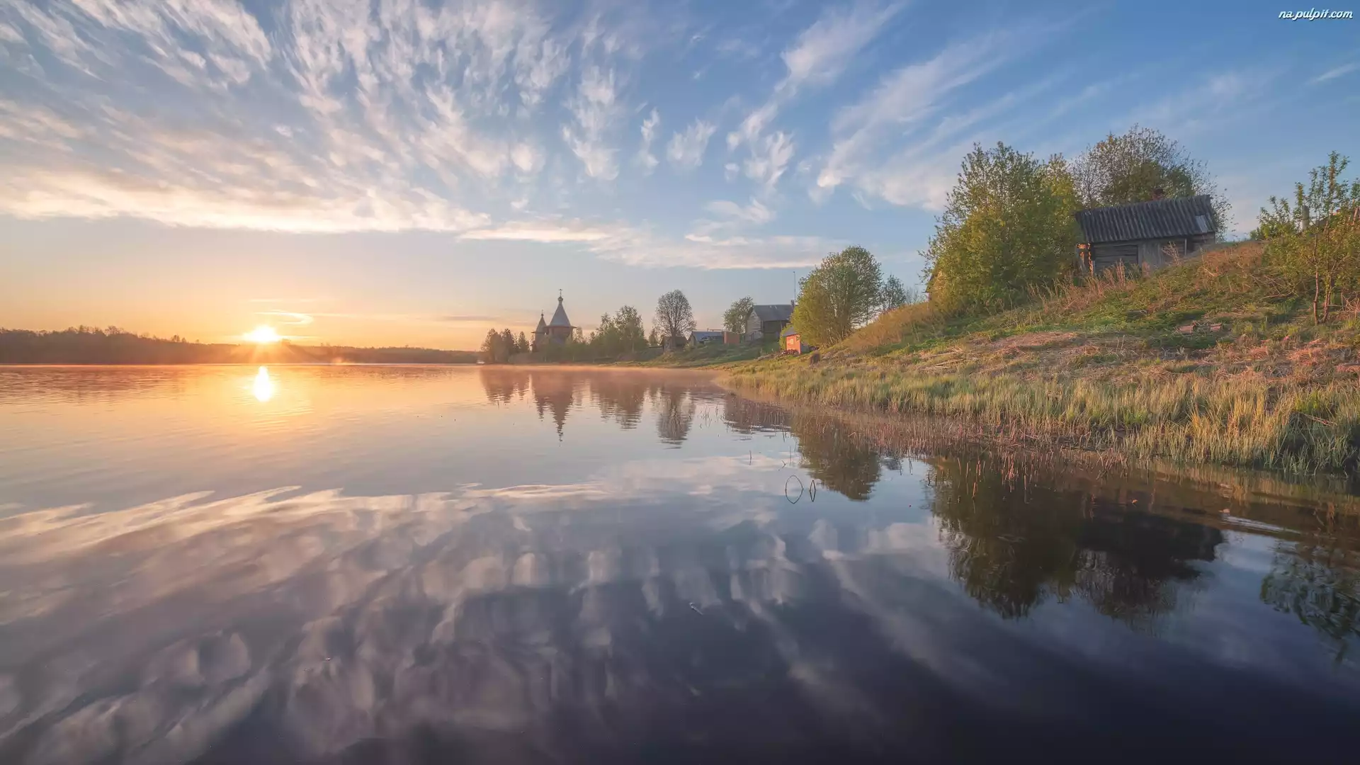 Odbicie, Jezioro, Dom, Lato, Drzewa, Zachód słońca