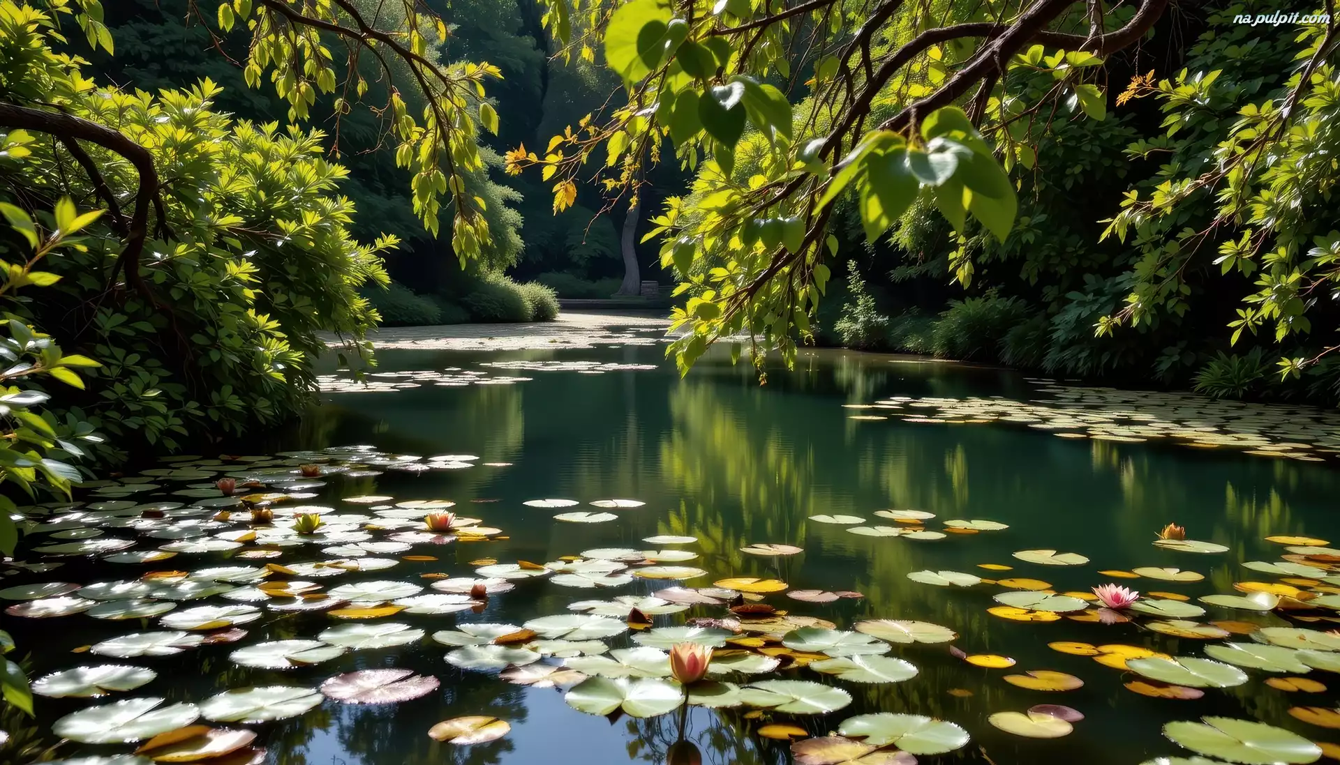 Grafika, Drzewa, Gałęzie, Staw, Lilie wodne, Zwisające, Lato Na Pulpit
