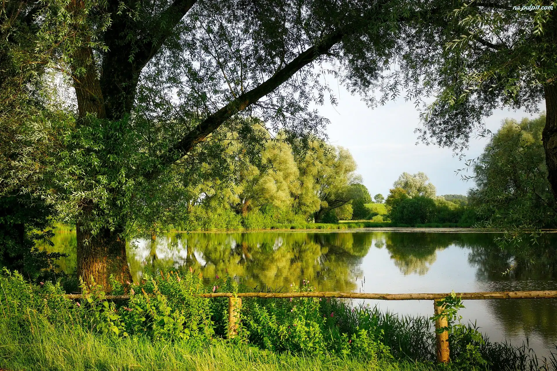 Lato, Roślinność, Drzewa, Jezioro, Ogrodzenie