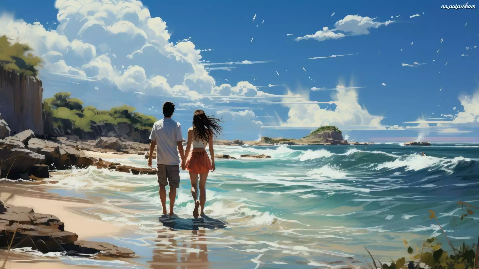 Lato, Grafika, Mężczyzna, Plaża, Morze, Para, Kobieta, Skały, Fale Na Pulpit