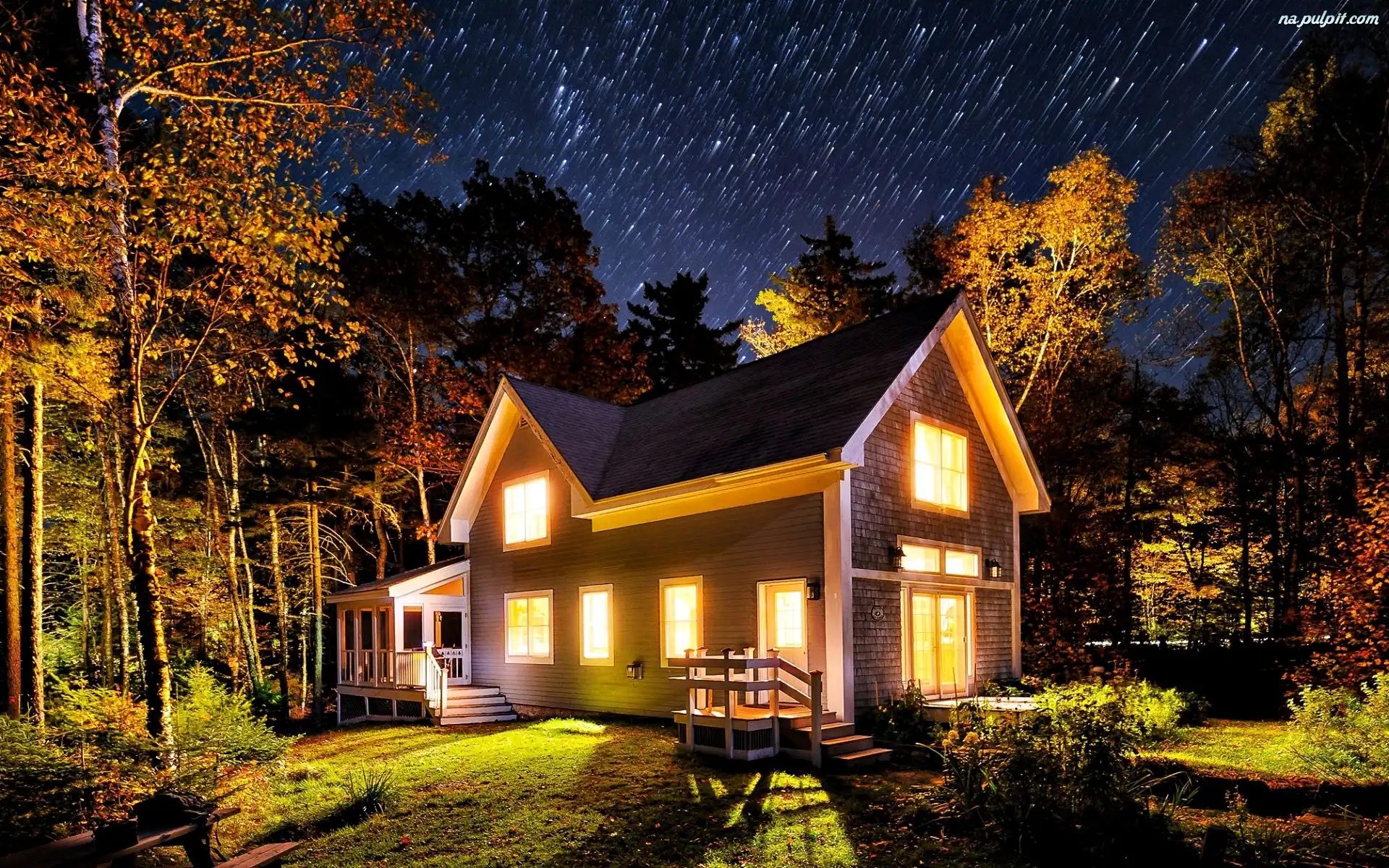 Lato, Noc, Dom, Oświetlony, Gwiazdy Na Pulpit