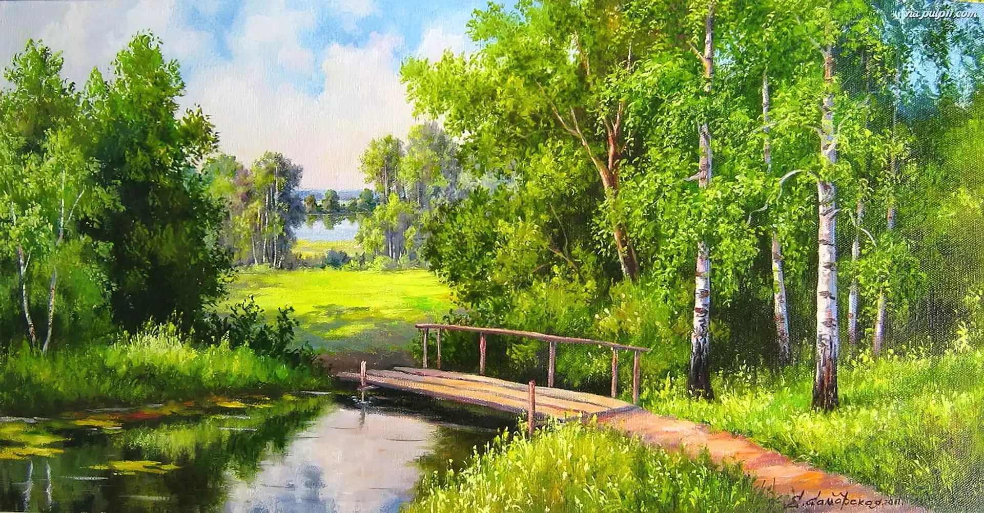 Lato, Rzeka, Brzozy, Zagajnik, Kładka