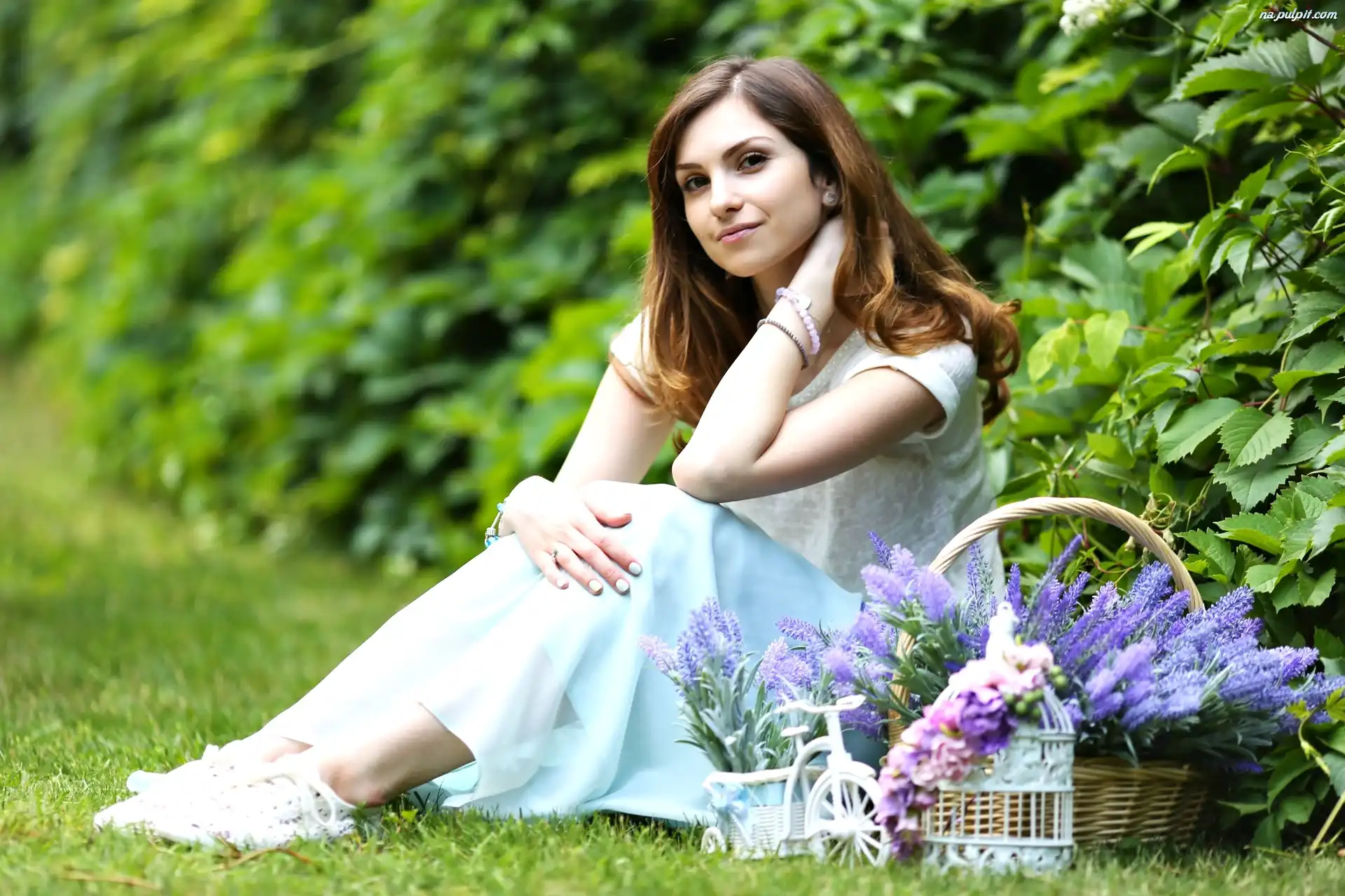 Lawenda, Kosz, Zieleń, Kobieta, Kwiaty