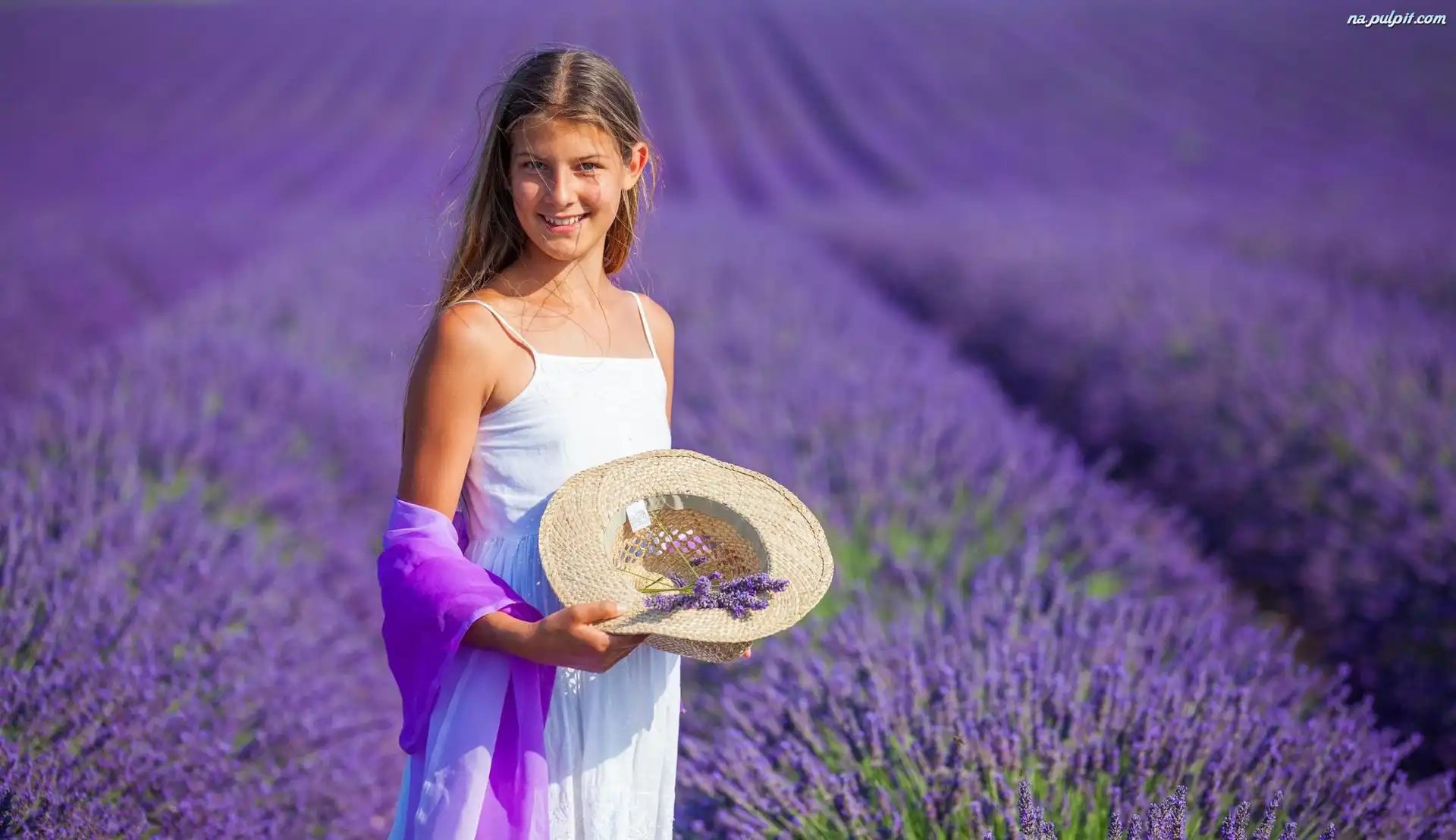 Lawenda, Kapelusz, Dziewczynka, Uśmiechnięta, Pole Na Pulpit