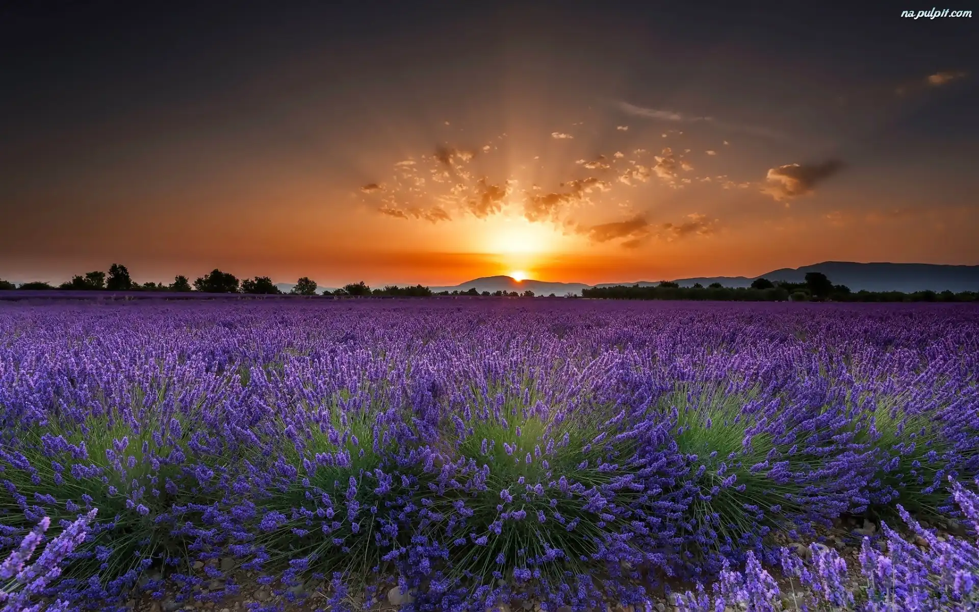Lawendowe, Zachód, Słońca, Drzewa, Pole, Góry
