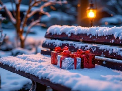Prezenty, Zima, Ośnieżona, Ławka, Noc, Latarnia
