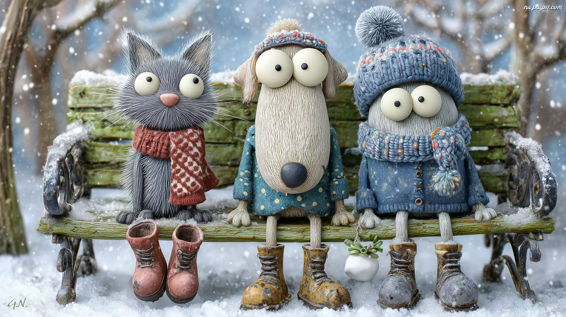 Zima, Pies, Ludzik, Ławka, Kot, Grafika AI Na Pulpit