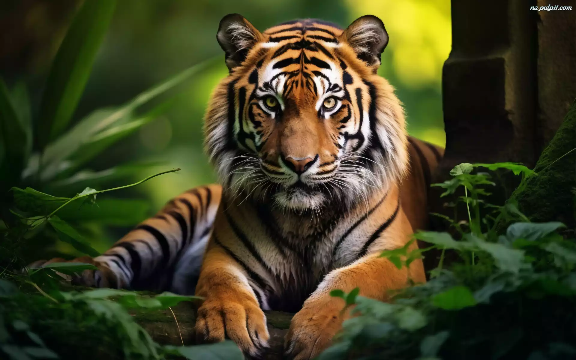 Spojrzenie, Leżący, Tygrys, Rośliny, Głowa Na Pulpit