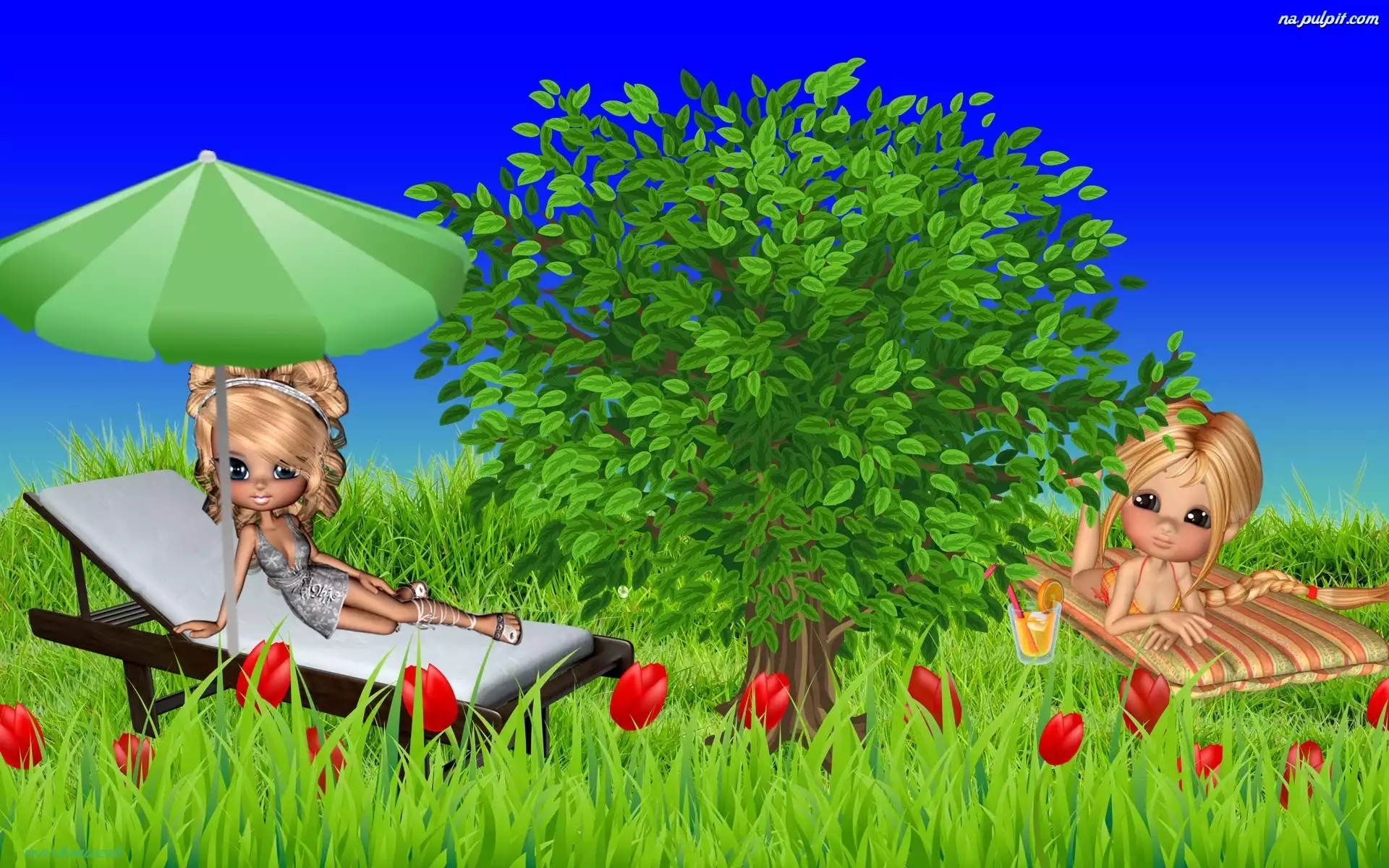 Leżak, Parasol, 2D, Drzewo, Łąka, Kwiaty Na Pulpit
