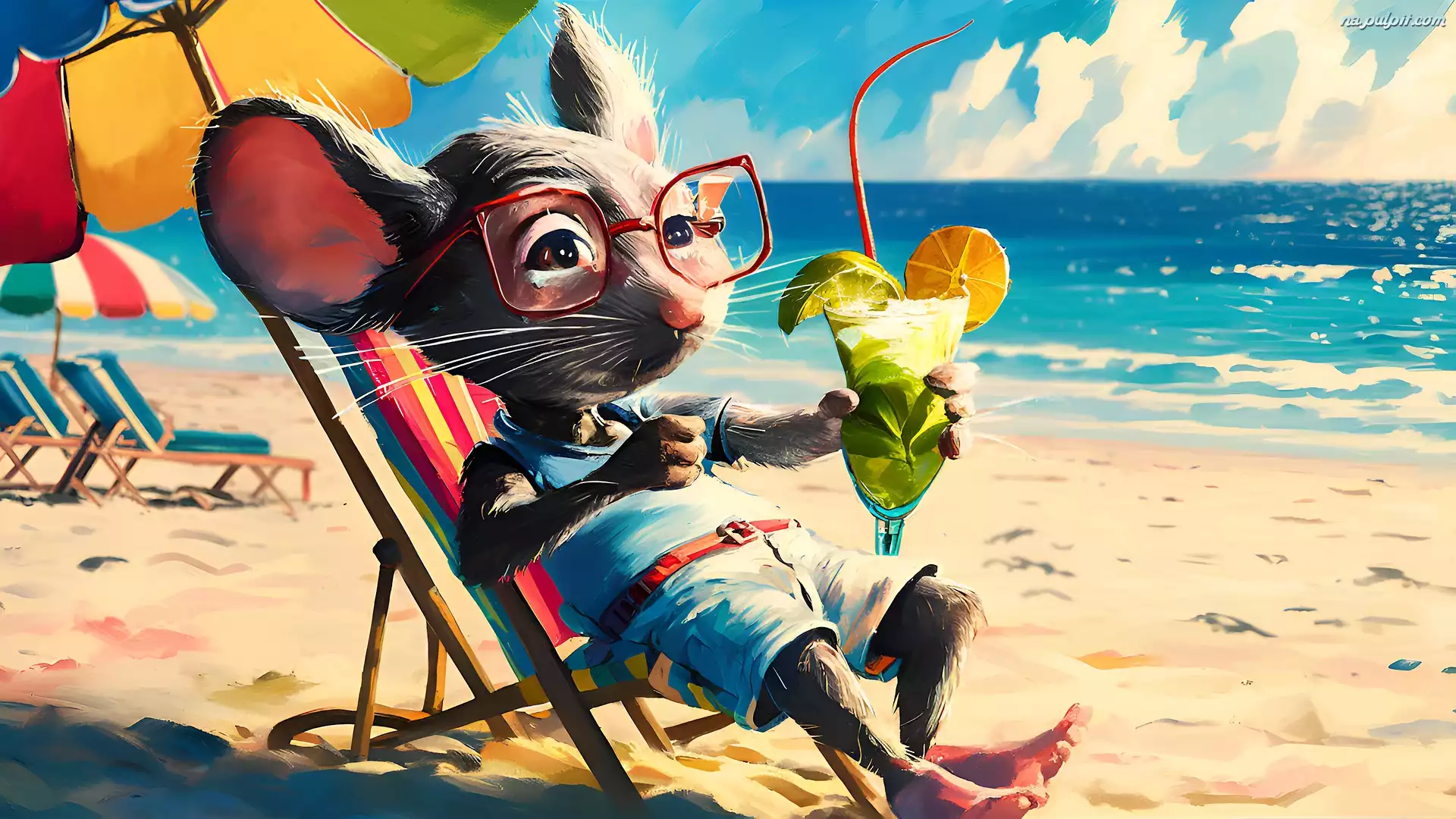 Parasol, Napój, Morze, Śmieszne, Grafika, Plaża, Myszka, Leżak Na Pulpit