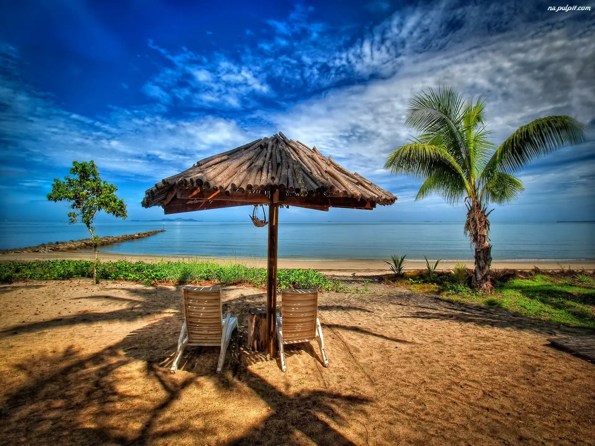Wakacje, Parasol, Palmy, Morze, Leżaki