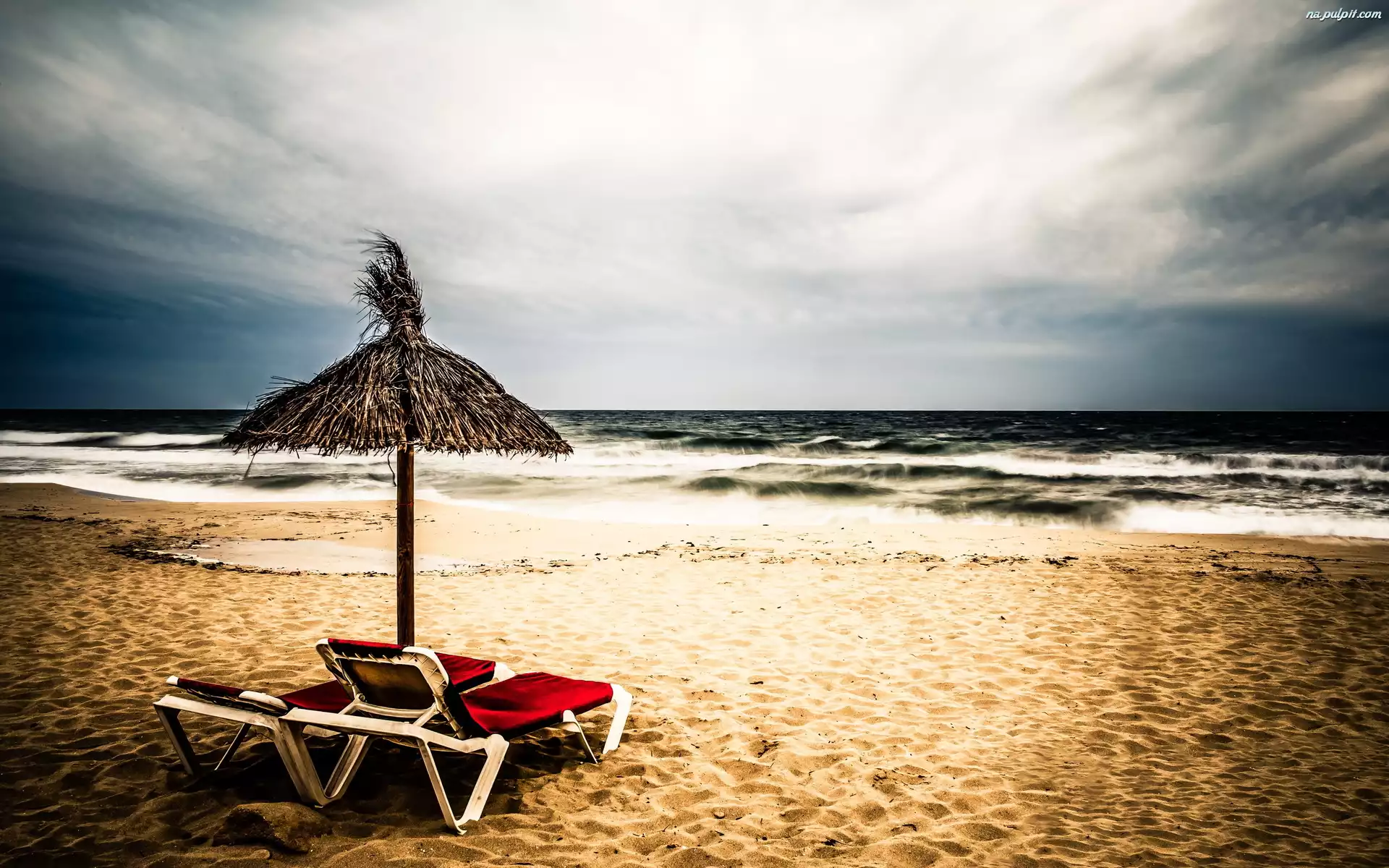 Wakacje, Słońca, Parasol, Plaża, Morze, Zachód, Leżaki