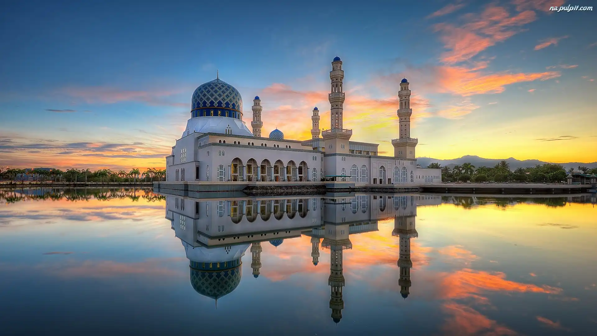 Borneo, Zatoka Likas, Wschód Słońca, Kota Kinabalu, Malezja, Meczet City Mosque