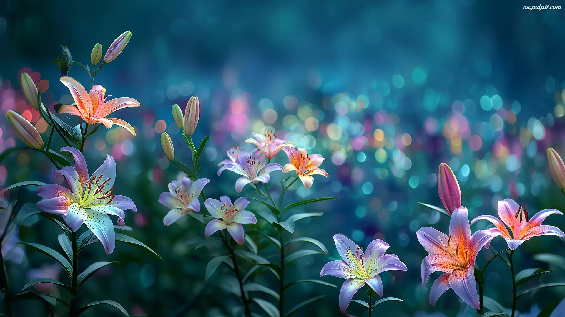 Kolorowe, Lilie, Bokeh, Grafika AI Na Pulpit