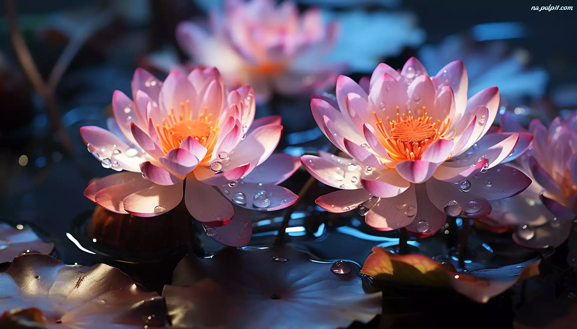 Kwiaty, Lilie wodne, Krople, Liście Na Pulpit