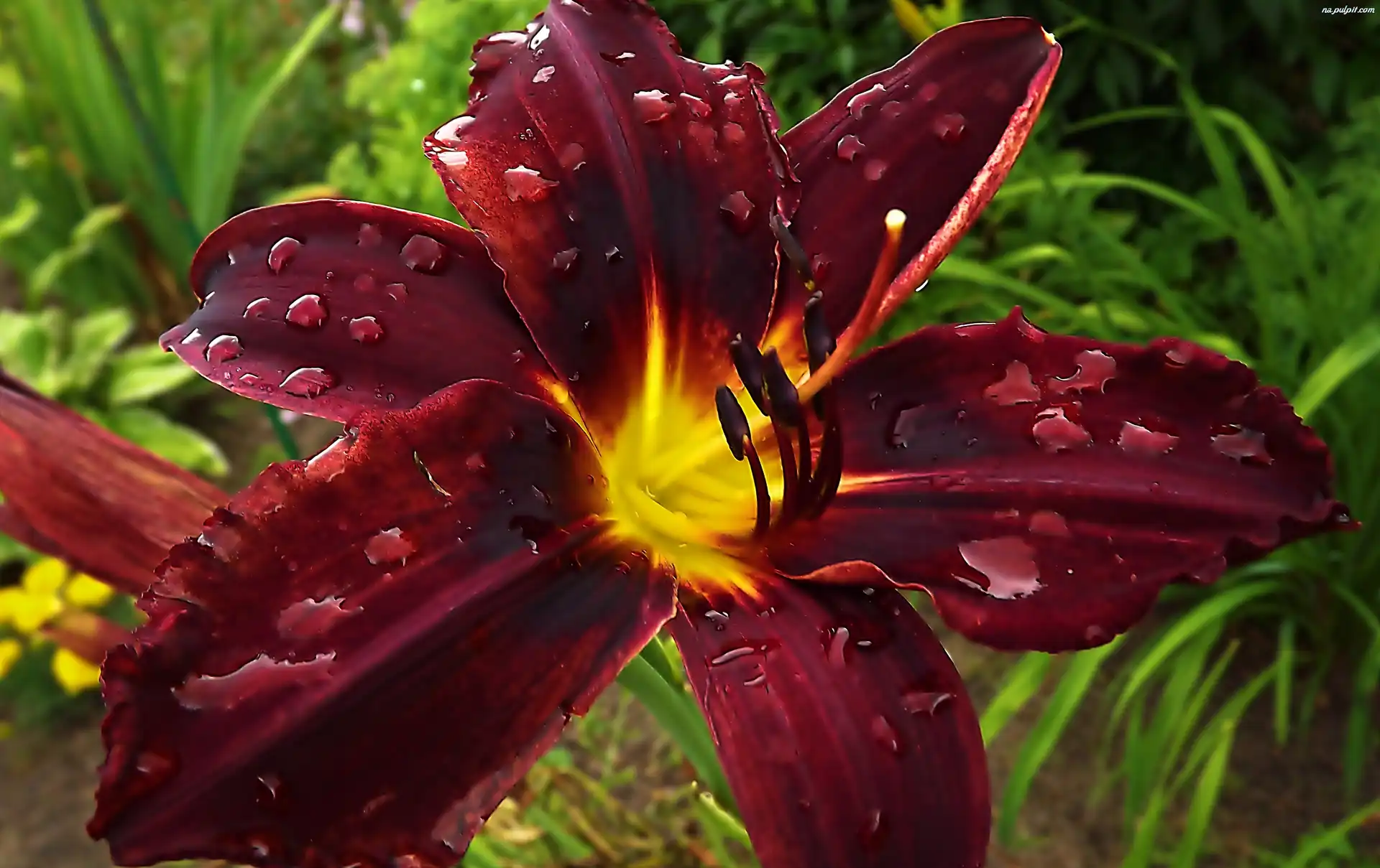 Makro, Liliowiec, Wody, Środek, Żółty, Bordowy, Krople