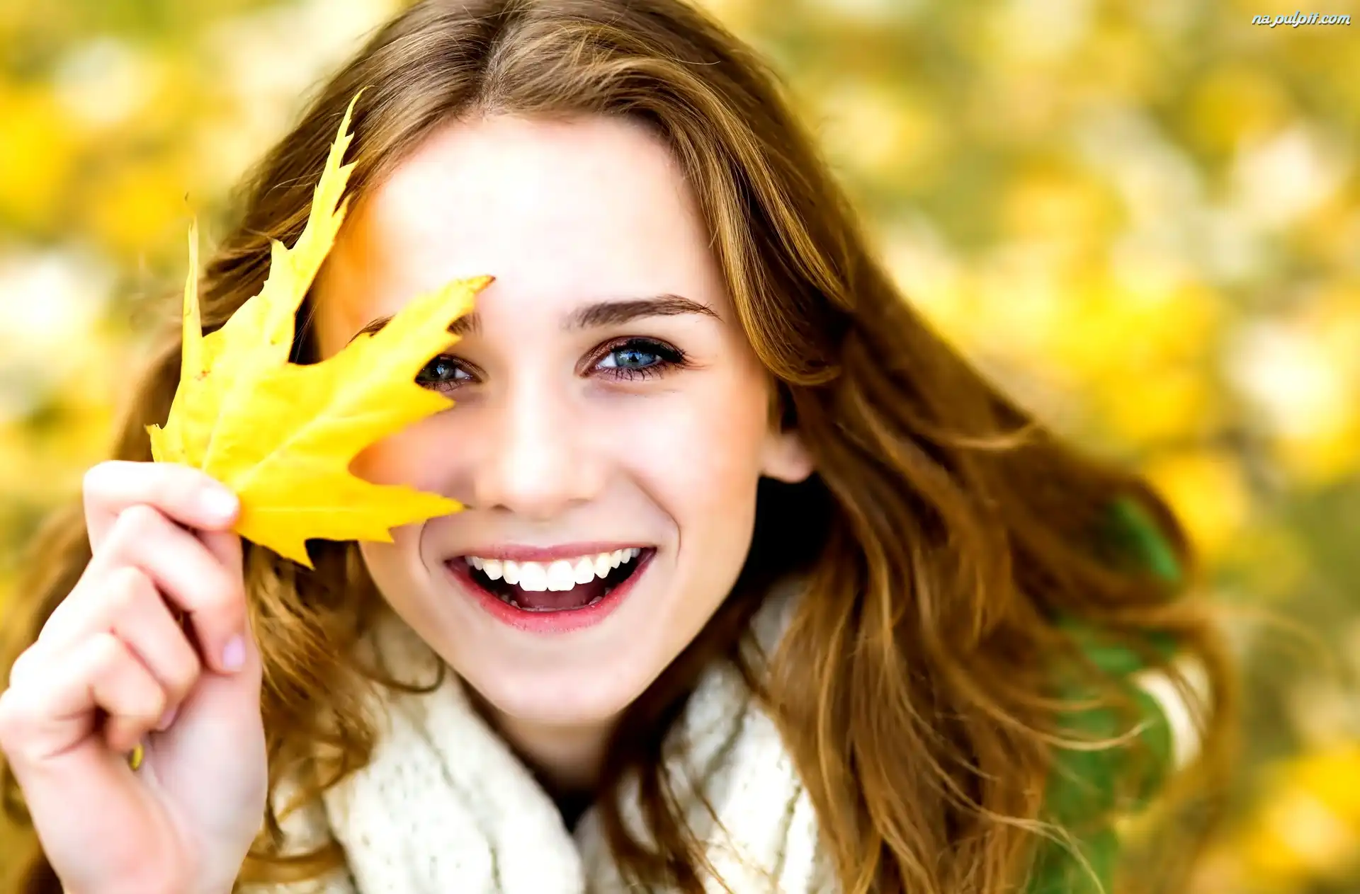 Liść, Kobieta, Uśmiechnięta, Żółty Na Pulpit