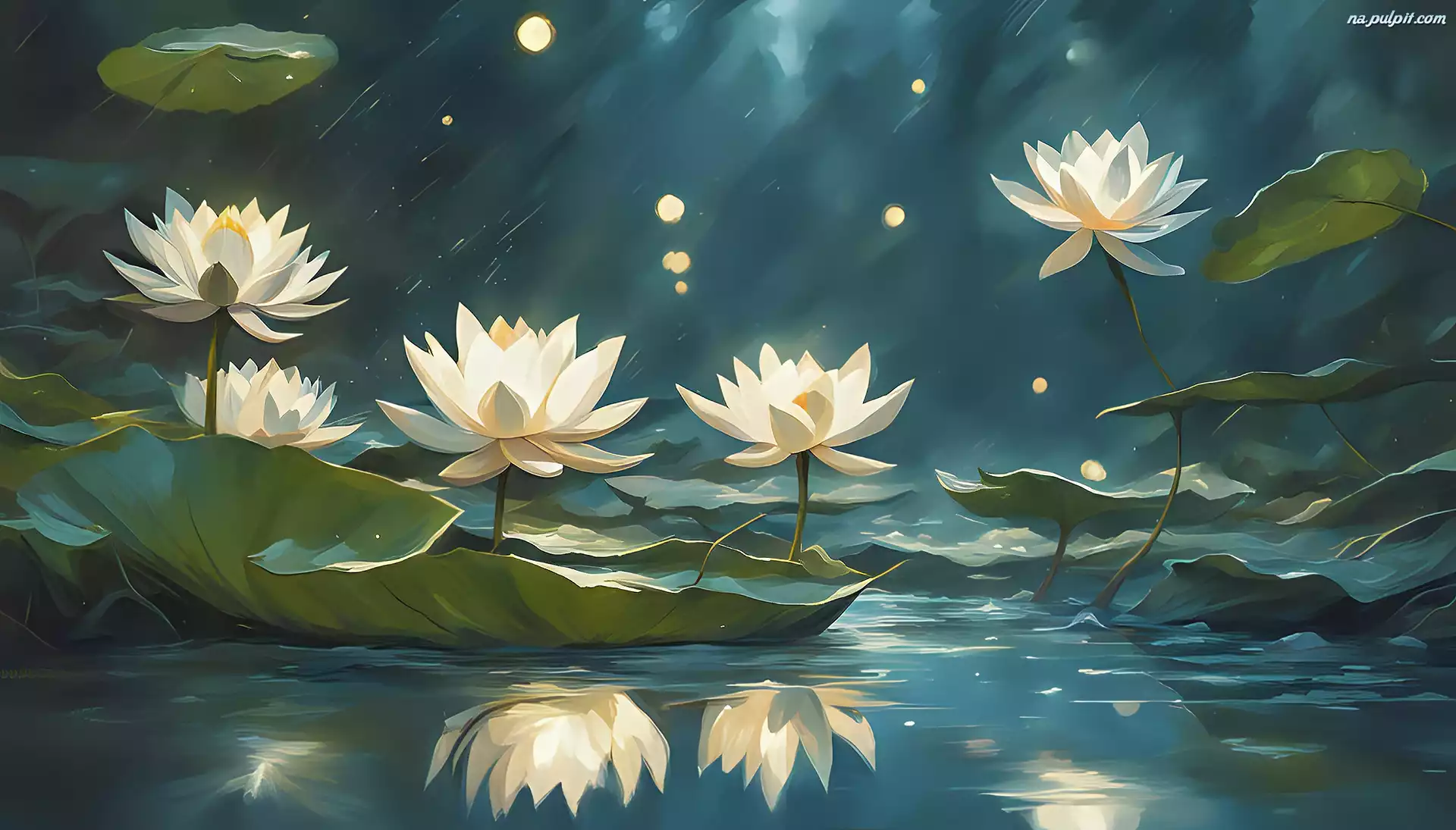 Białe, Lilie wodne, Liście, Grafika 2D Na Pulpit