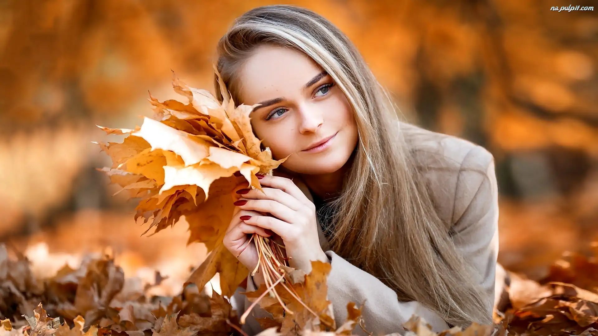 Liście, Kobieta, Blondynka, Jesienne Na Pulpit