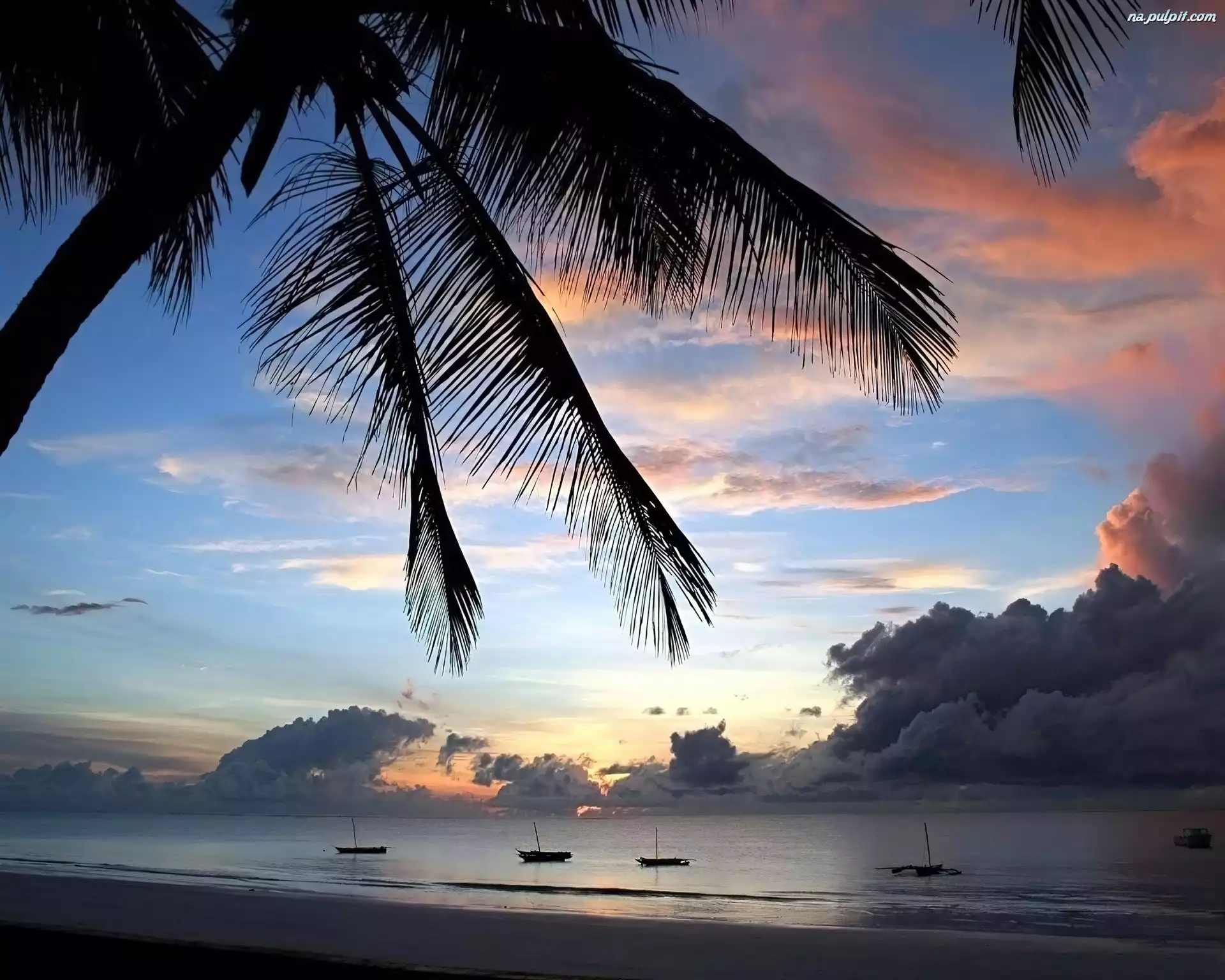 Liście, Zachód, Słońca, Palmy, Chmury, Woda Na Pulpit