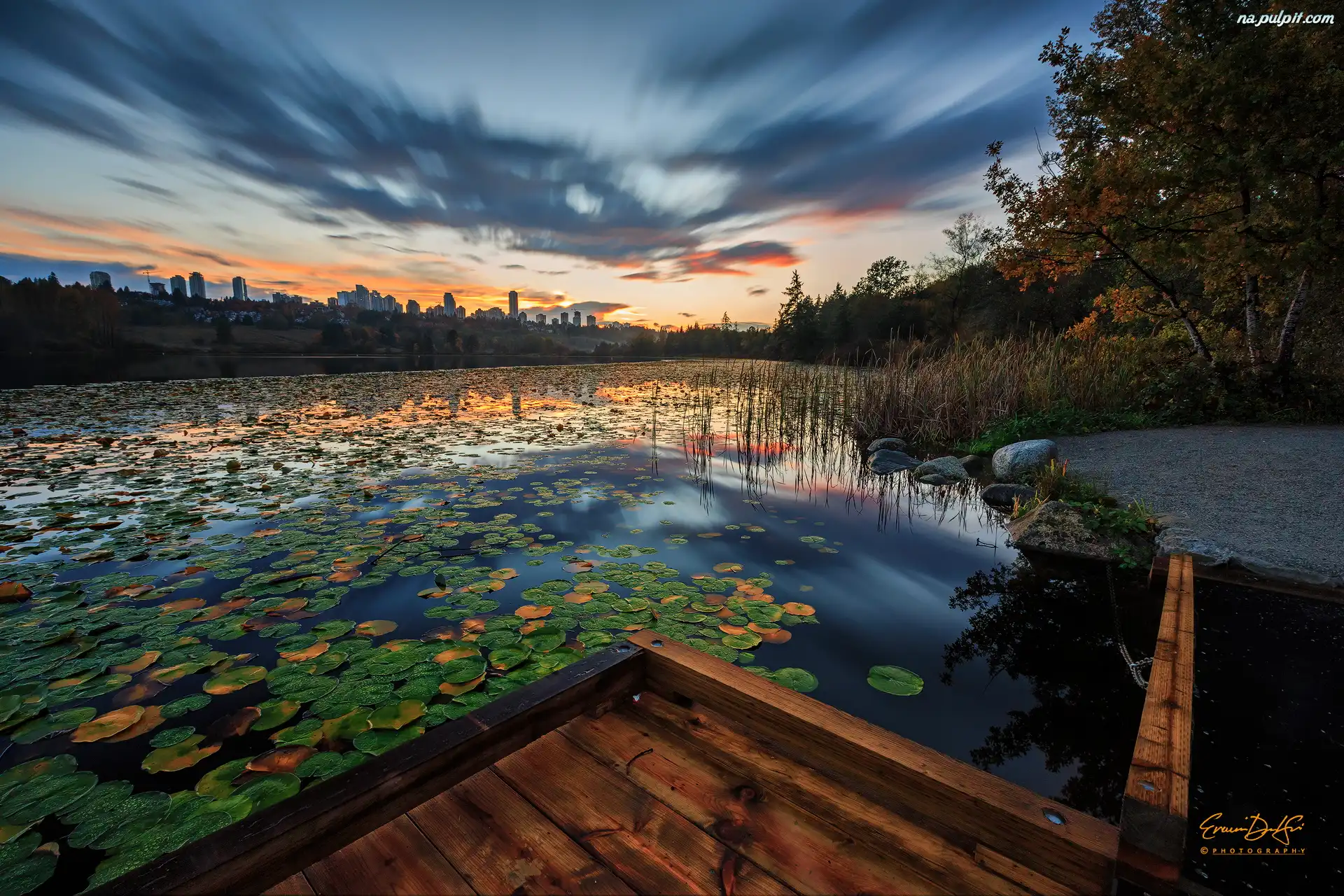 Chmury, Liście, Staw, Zachód słońca, Lilie wodne Na Pulpit