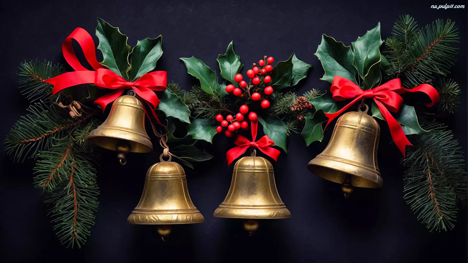 Jagody, Gałązki, Czerwone, Złote, Dekoracja, Kokardki, Dzwoneczki, Liście Na Pulpit