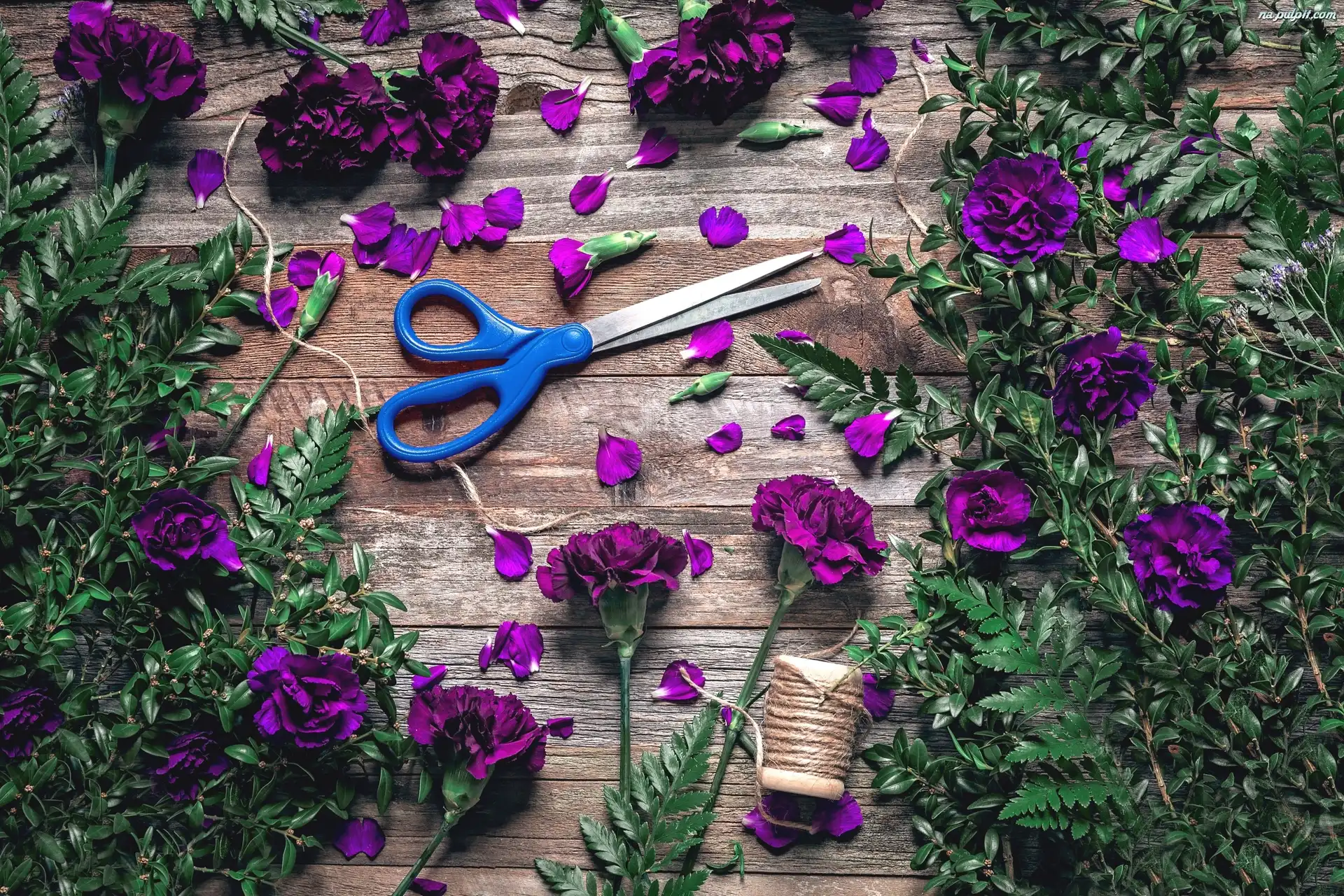 Deski, Liście, Nożyczki, Szpulka, Paproci, Goździki, Sznurek