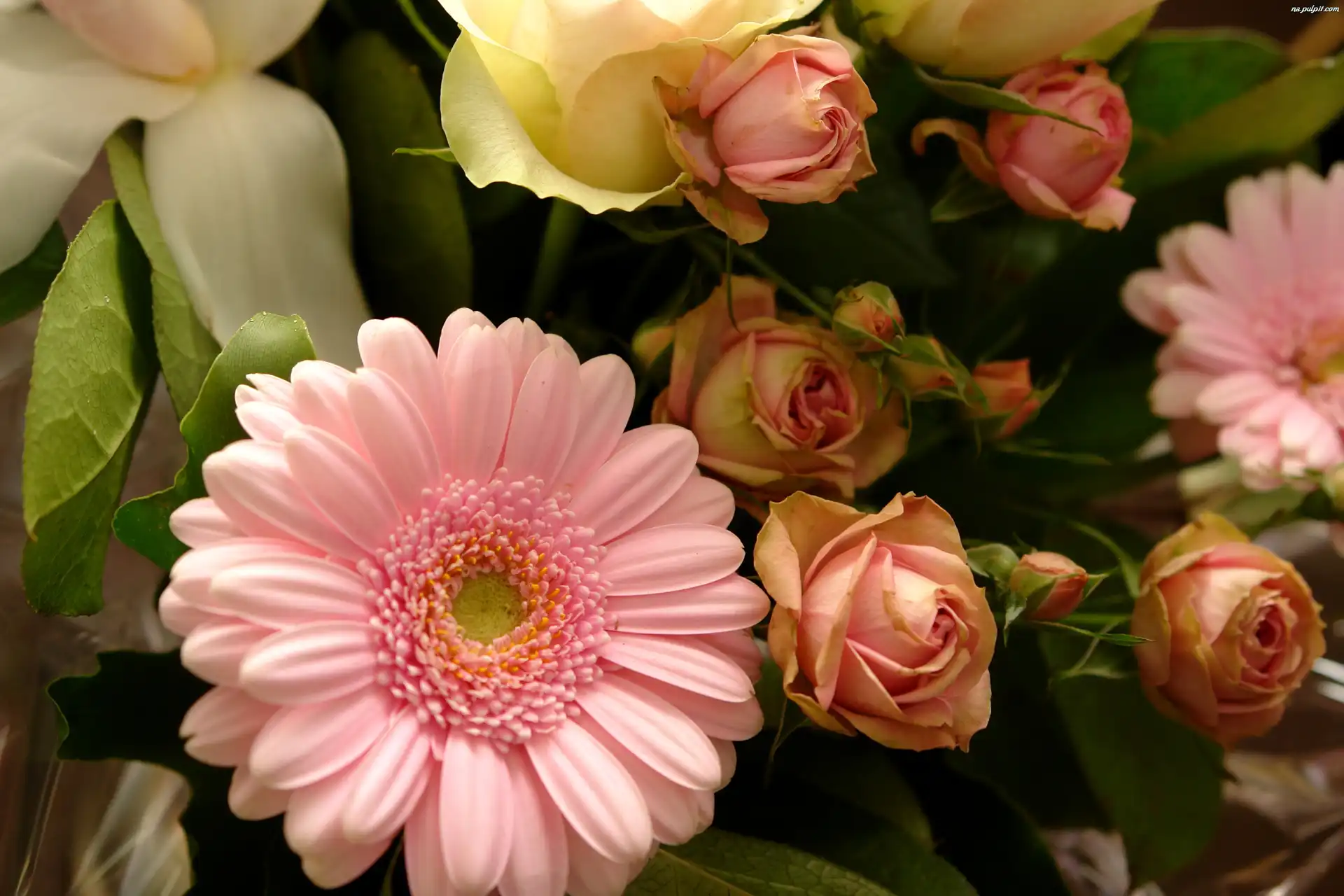 Liście, Róże, Gerbera, Pąki