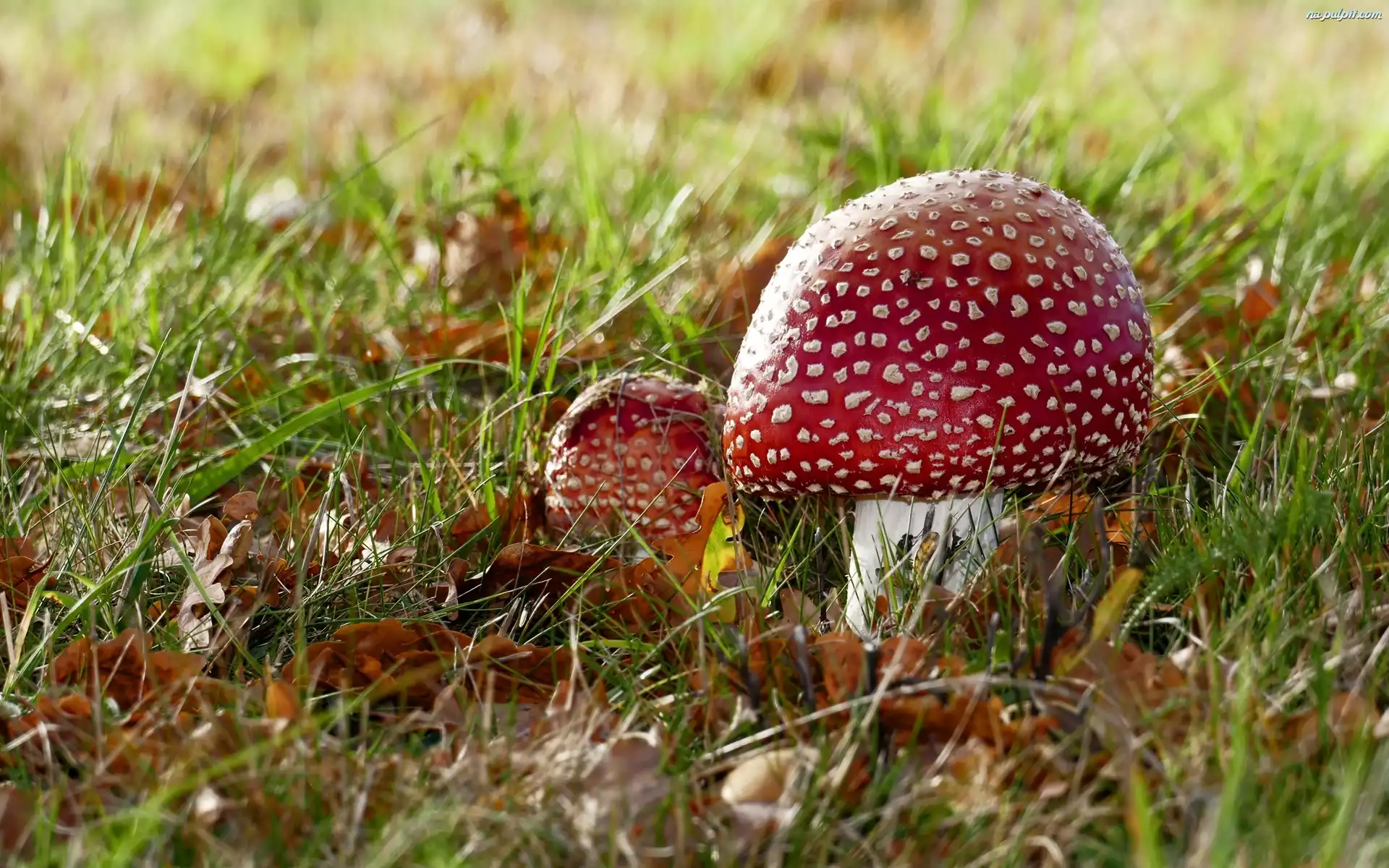 Liście, Łąka, Muchomory, Grzyby, Trawa