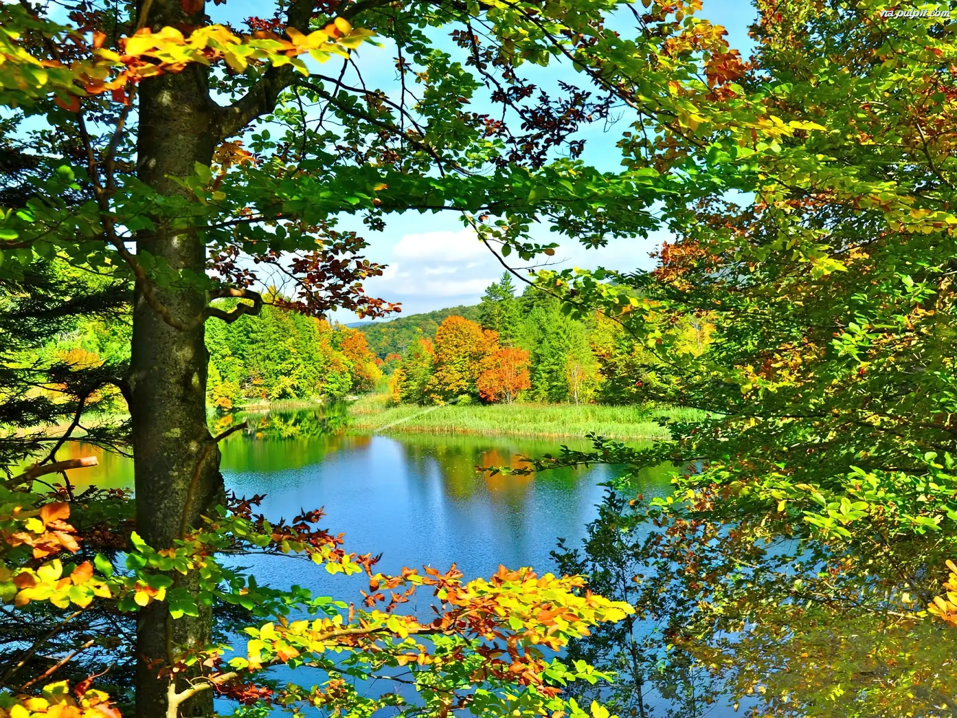 Liście, Drzewa, Jezioro, Jesień, Kolorowe Na Pulpit