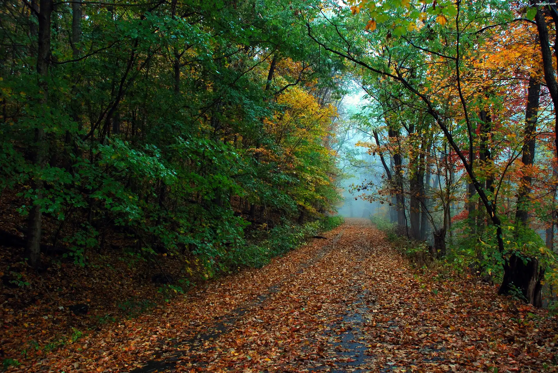 Liście, Droga, Las, Jesień, Drzewa