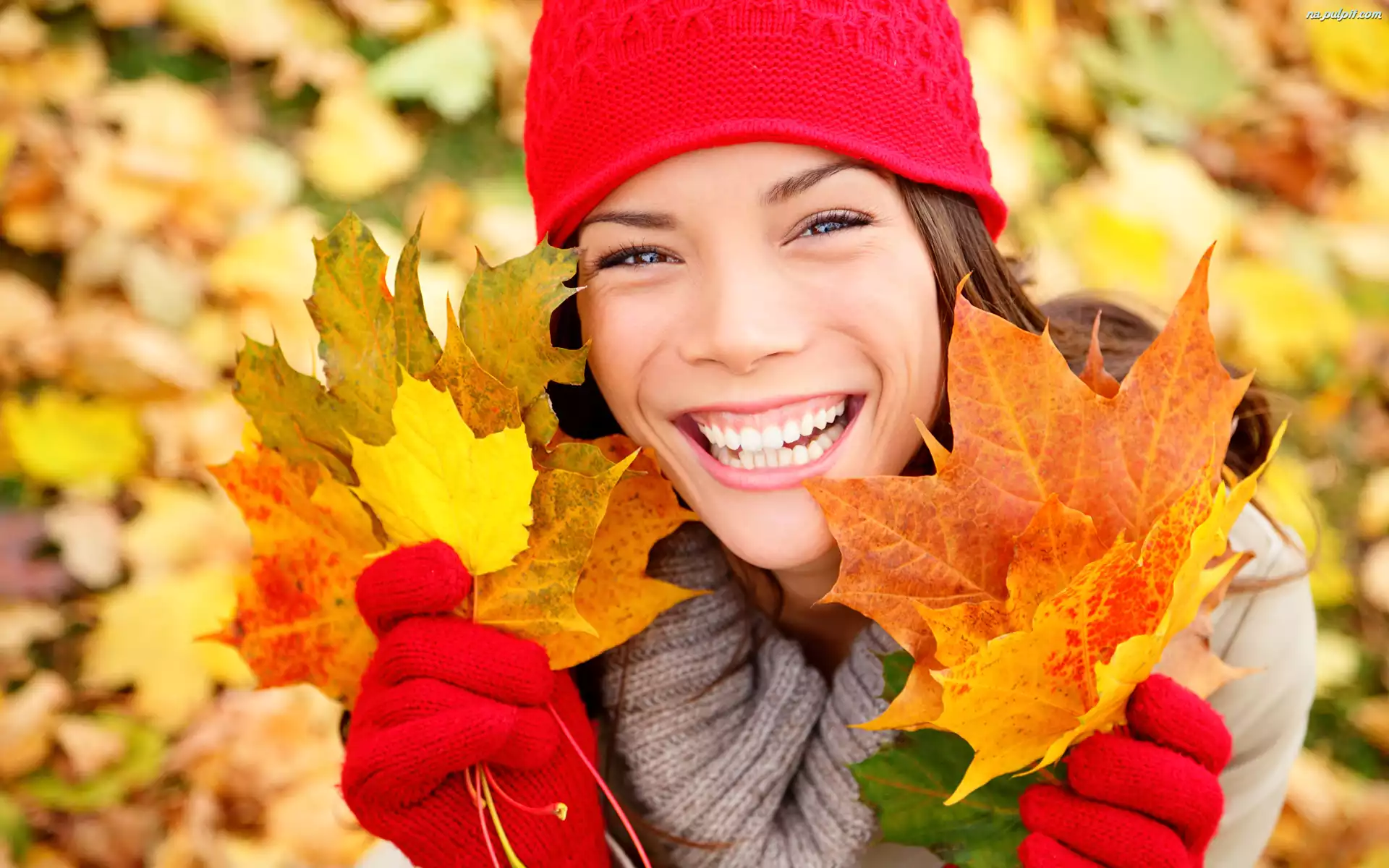 Liście, Rękawiczki, Uśmiech, Dziewczyna, Jesień, Czapka Na Pulpit