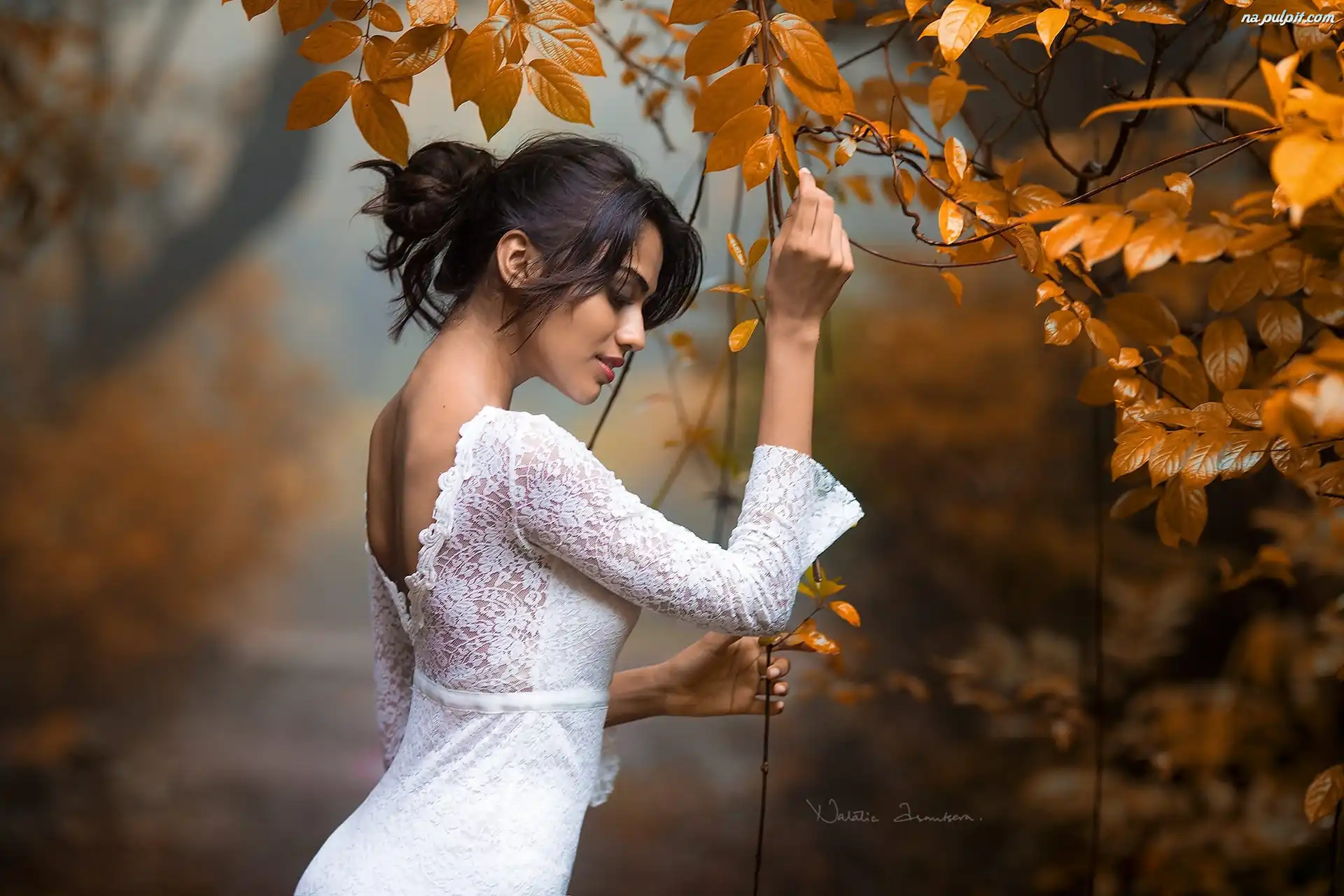 Liście, Suknia, Biała, Kobieta, Drzewo Na Pulpit