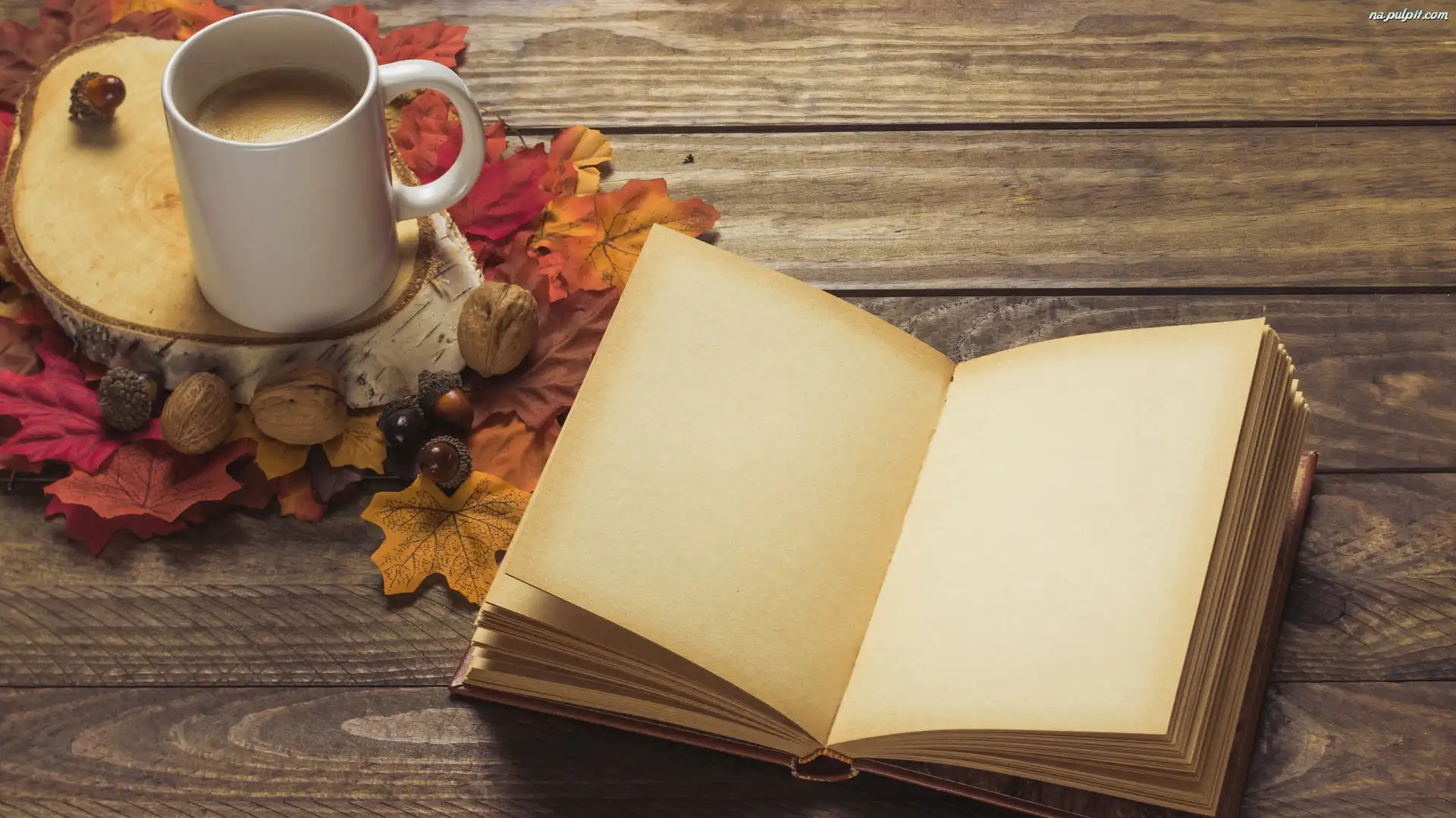Kompozycja, Liście, Deski, Żołędzie, Orzechy, Kawa, Zeszyt