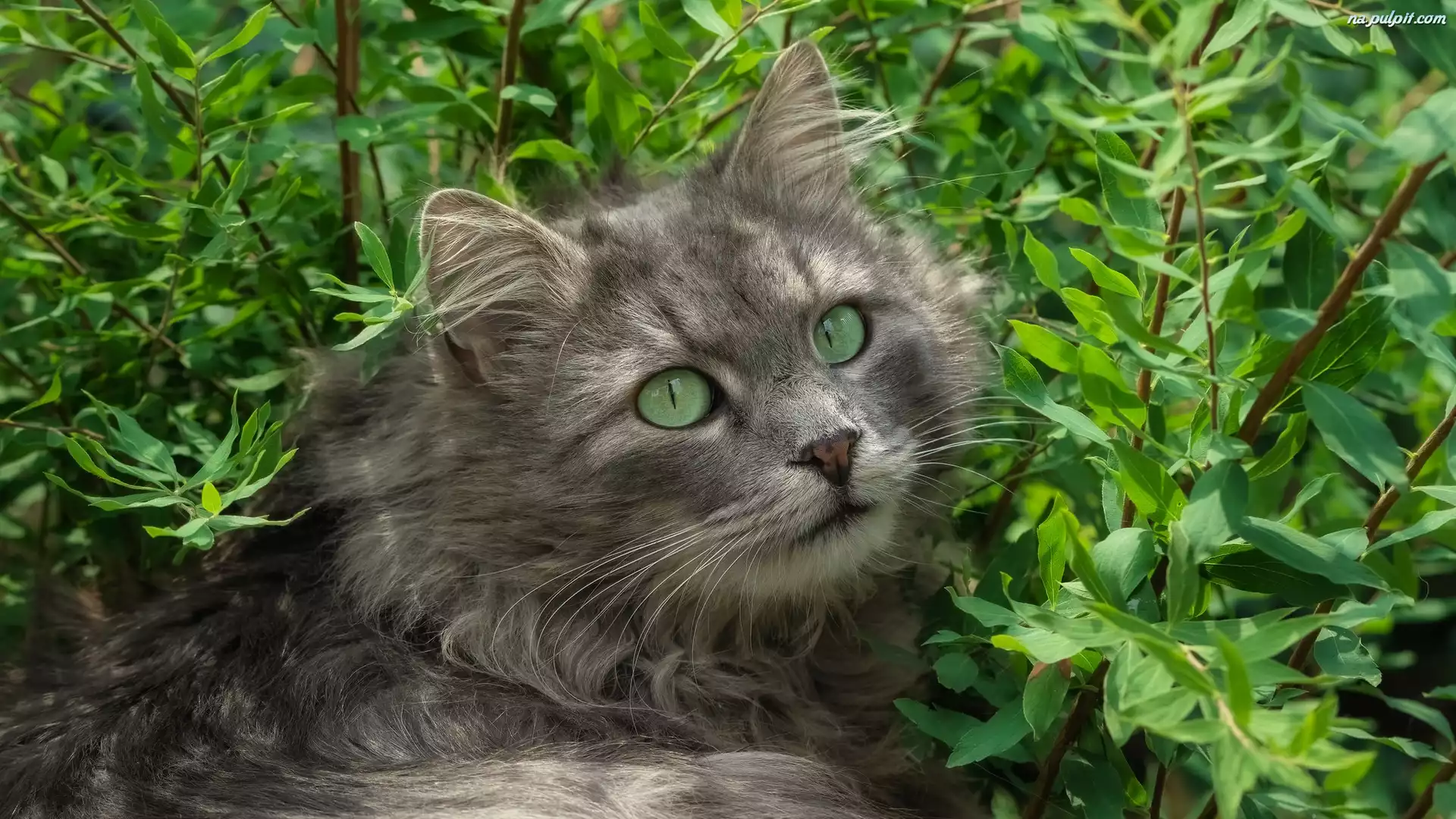 Kot, Szary, Gałązki, Liście Na Pulpit