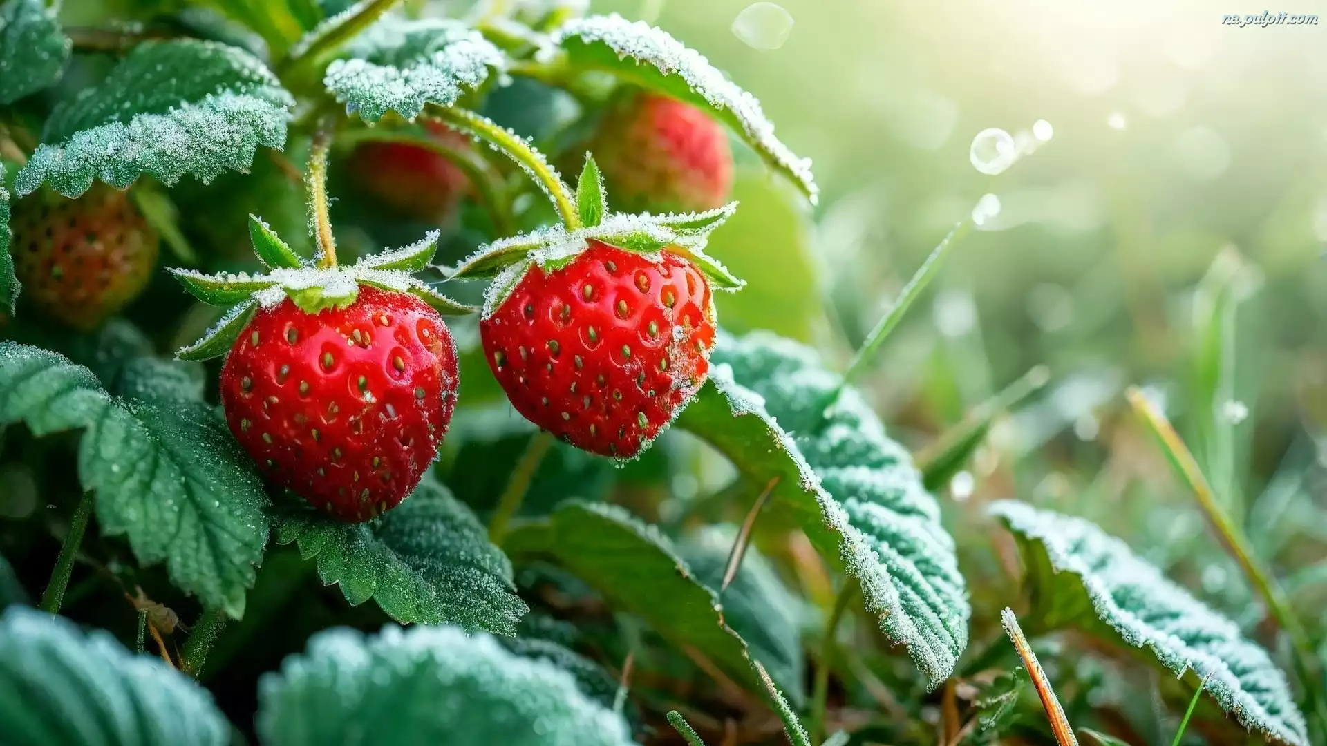 Oszronione, Truskawki, Zielone, Liście Na Pulpit