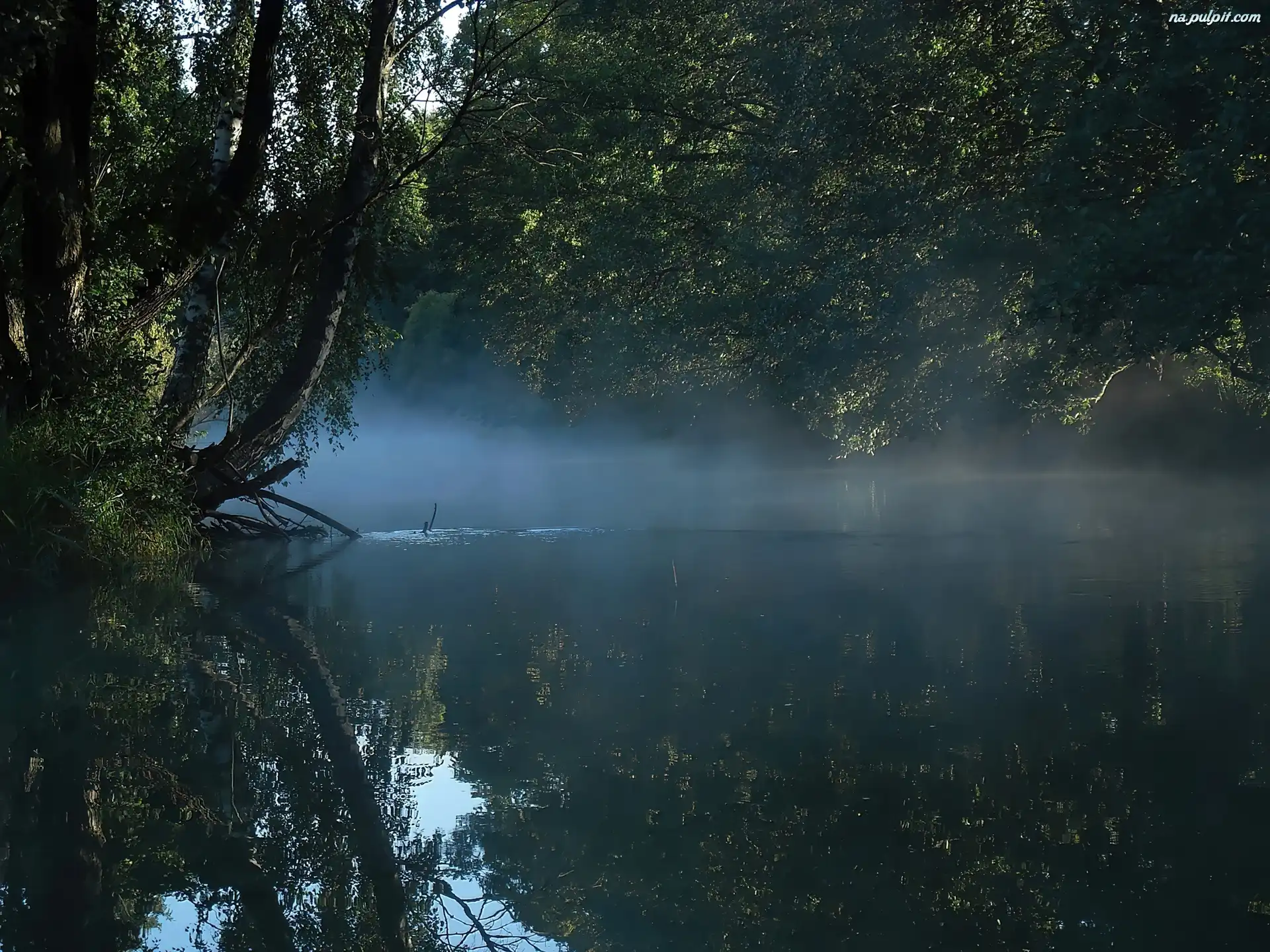 Liście, Mgła, Rzeka, Brzoza Na Pulpit